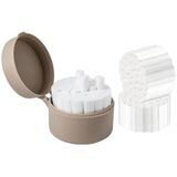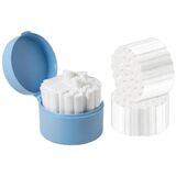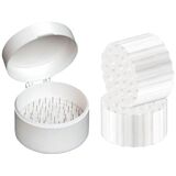 Cotton roll holder with hinged lid and stainless pins embedded in weighted bottom to hold cotton roll in neat upright position, comes with 100/Pcs cotton rolls.