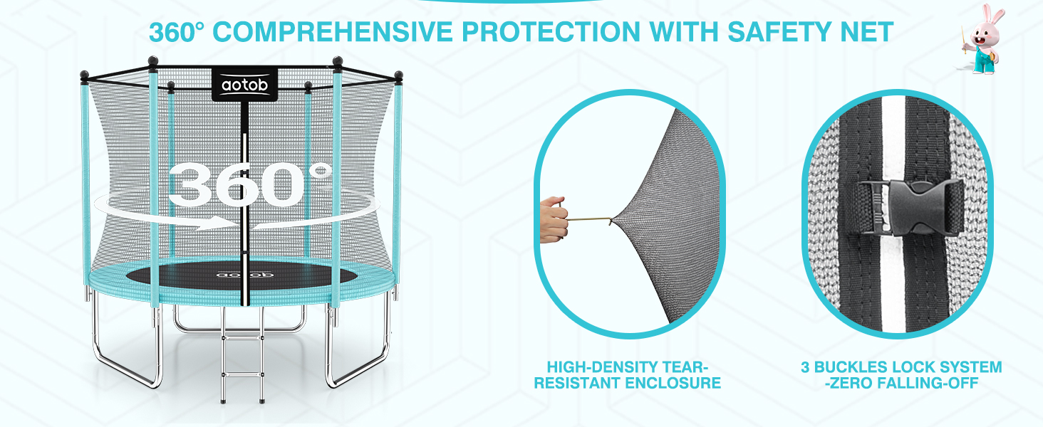 • Safety First: AOTOB trampolines are tested for safety and durability to meet or exceed American Society of Testing Materials (ASTM), Children's Product Certificate (CPC), TUV Certification and Testing, CONFORMITE EUROPEENNE (CE) all standards. We are extremely exacting when it comes to safety.