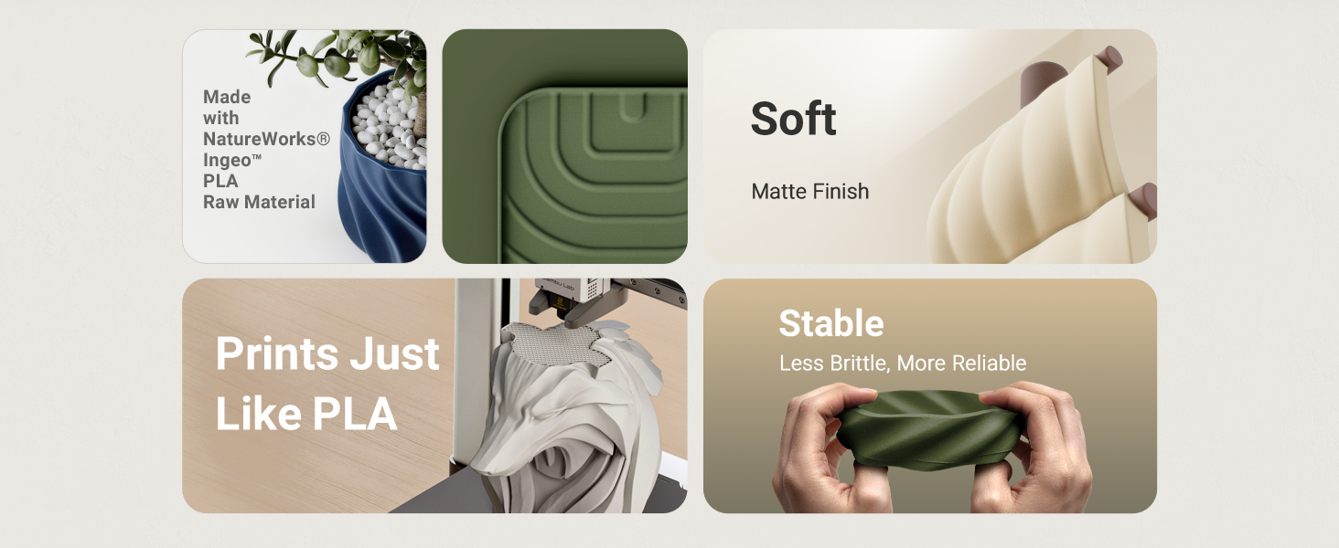 Prints Just Like PLA: Print with the familiar ease of PLA, enhanced toughness, and reduced brittleness. Strong layer adhesion and low warping ensure consistent results. Recommended settings: print speed under 300 mm/s, nozzle 190–230℃, bed 35–60℃. Dry at 50℃ for 8 hours before use for best surface quality and bonding.