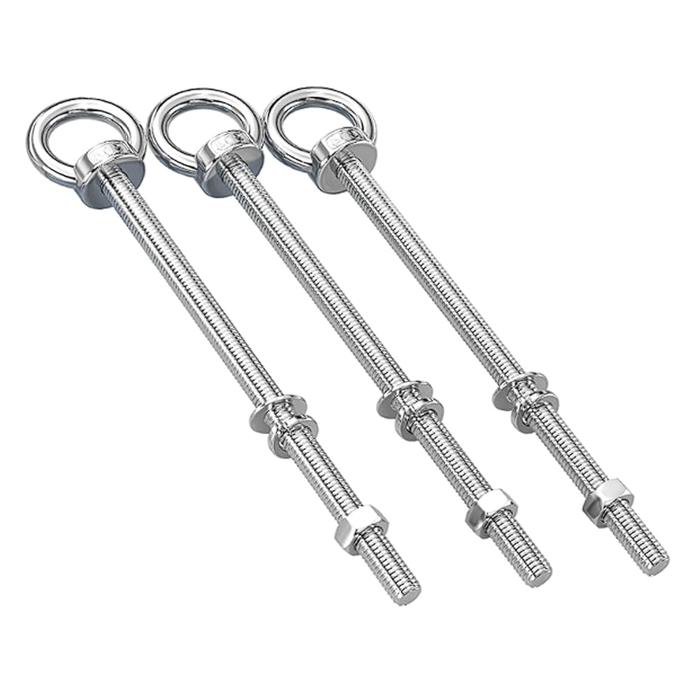 Complete 3-Pack Hardware Sets: Each order includes 3 ready-to-use eyebolt sets. Every set contains one eyebolt, one hex nut, one flat washer, and one spring washer—all 304 stainless steel for perfect compatibility and hassle-free installation right out of the package.