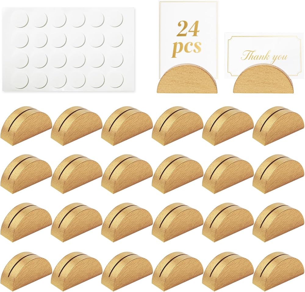 Stable Card Holders: You will receive 24-Pack Gold-Accented Wooden Place Card Holders + 24 Bonus Removable Glue Dots. These Glue Dots easily attach to the base of each semi-circular holder to prevent tipping—ensuring your display stays perfectly upright. Best of all, they are simple to remove without any sticky residue or damage to the wood, giving you peace of mind for repeat use