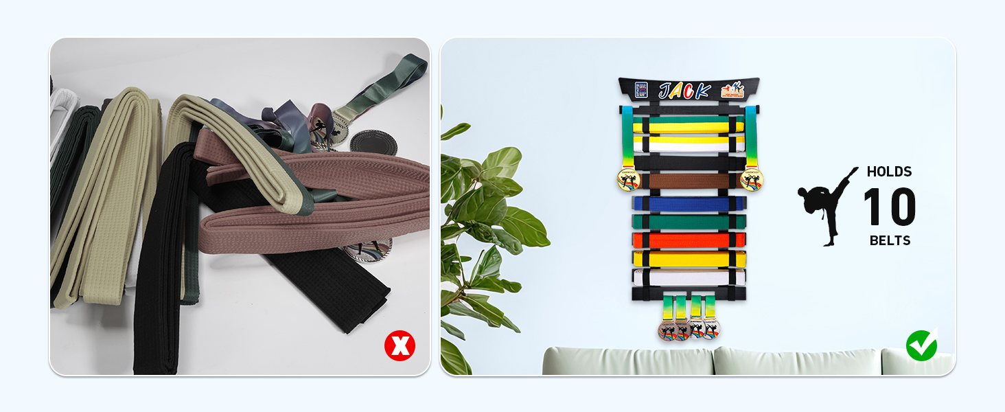 Hold 10 Belts and Multiple Medals: This karate belt display rack has ample space for up to 10 belts, keeping them organized. It can store belts for jiu-jitsu, martial arts, Taekwondo, etc. Proudly display your hard-earned achievements! It also features built-in medal hooks and holes, allowing you to display and store multiple medals alongside your belts. The hooks are secure and won't fall off, while the elastic band provides easy access to your belts