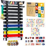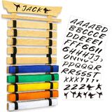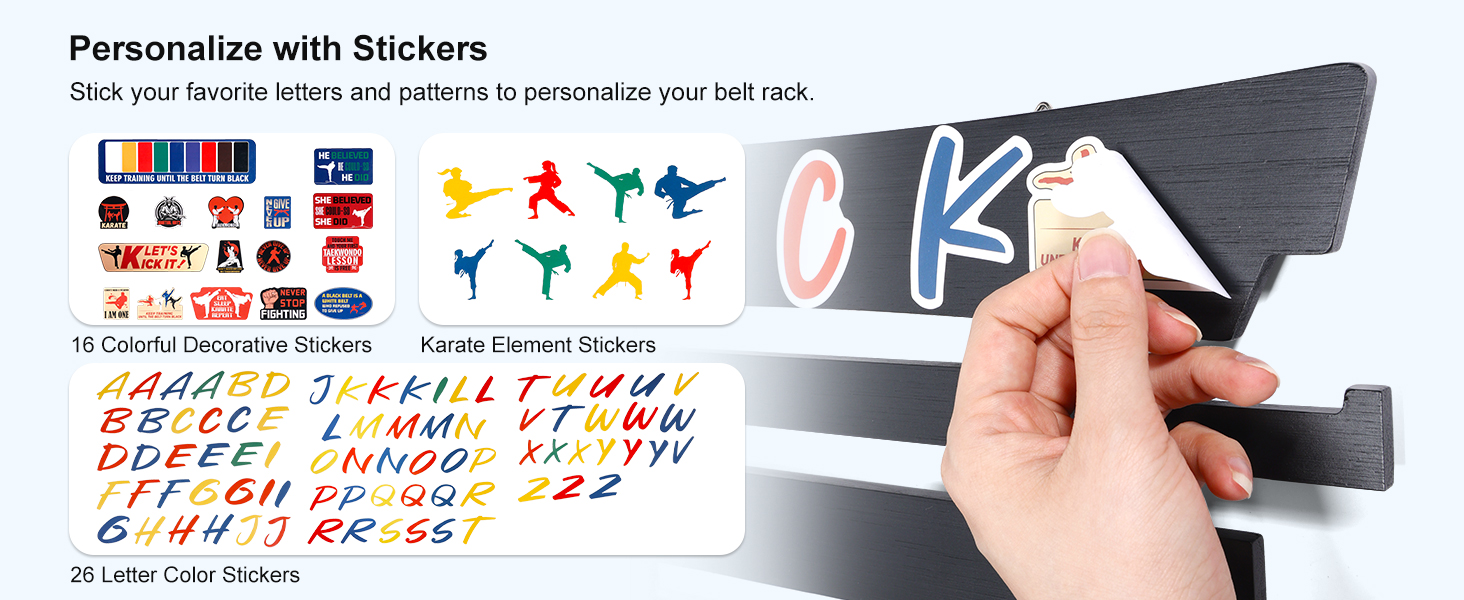 Personalized with Multi-Color Stickers: The taekwondo belt display set includes 16 vibrant decorative stickers and 26 alphabet stickers, plus karate element stickers. Spell out your name, honors, or motivational phrases to personalize your martial arts belt display —adding a touch of personality that celebrates your journey in martial arts. It's more than a rack; it's a reflection of your dedication