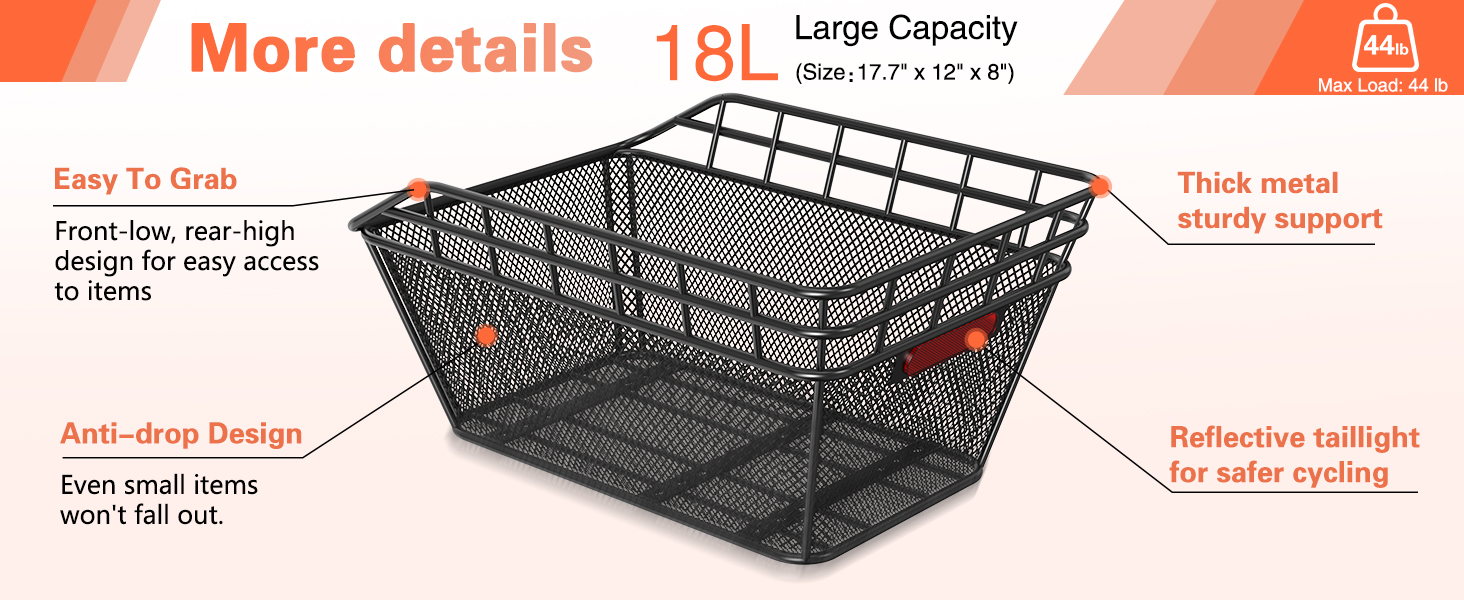 【Extra-Large Capacity】: 18L capacity (dimensions: 12“ x 17.7” x 8"). Provides ample space to easily hold daily odds and ends, backpacks, takeout, groceries, or personal gear, making every ride more convenient and practical.