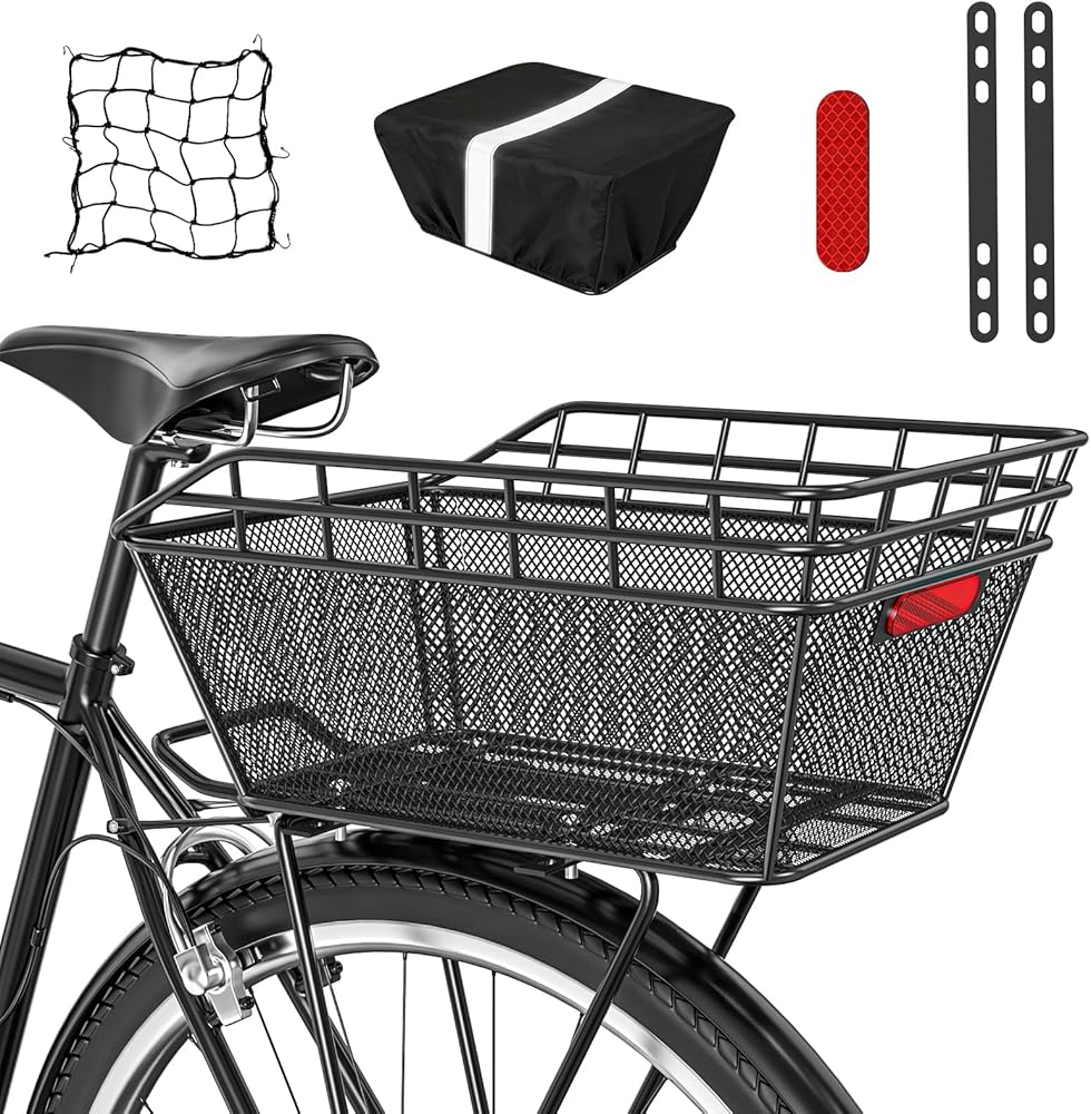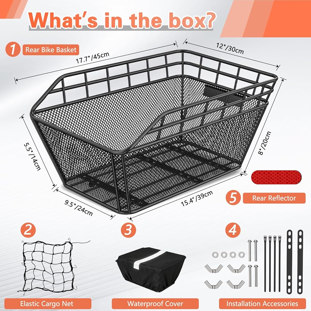 【Excellent Value Package】: Comes complete with a metal wire bike rear basket, full set of mounting hardware, waterproof cover, cargo net, and rear reflector—no additional purchases needed to start your bike cargo journey. Installed with two metal brackets and screw hardware, it offers effortless mounting and removal.