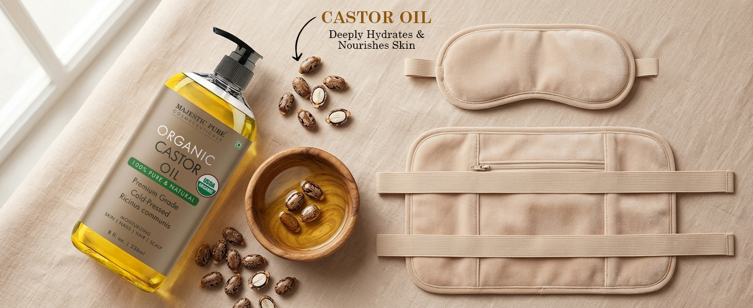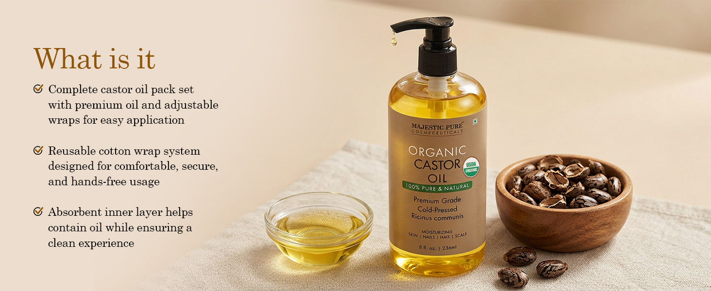 Premium Castor Oil Pack Experience: A complete organic castor oil pack wrap set featuring high-quality castor oil and adjustable wraps for neck and stomach application.