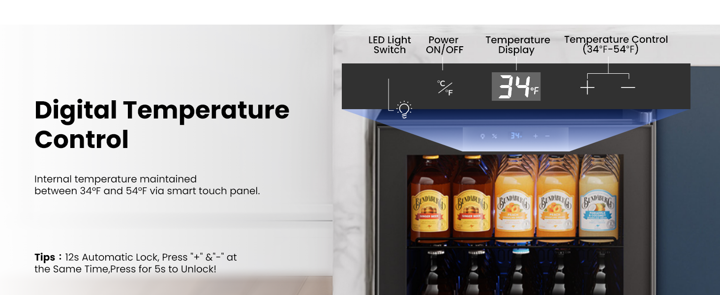 [Smart Temperature Control] Yeego beer fridge is designed with a smart touch control panel that includes temperature adjustment buttons and LED lighting controls, allowing you to set temperatures from 34℉ to 54℉ based on different beverage storage needs.