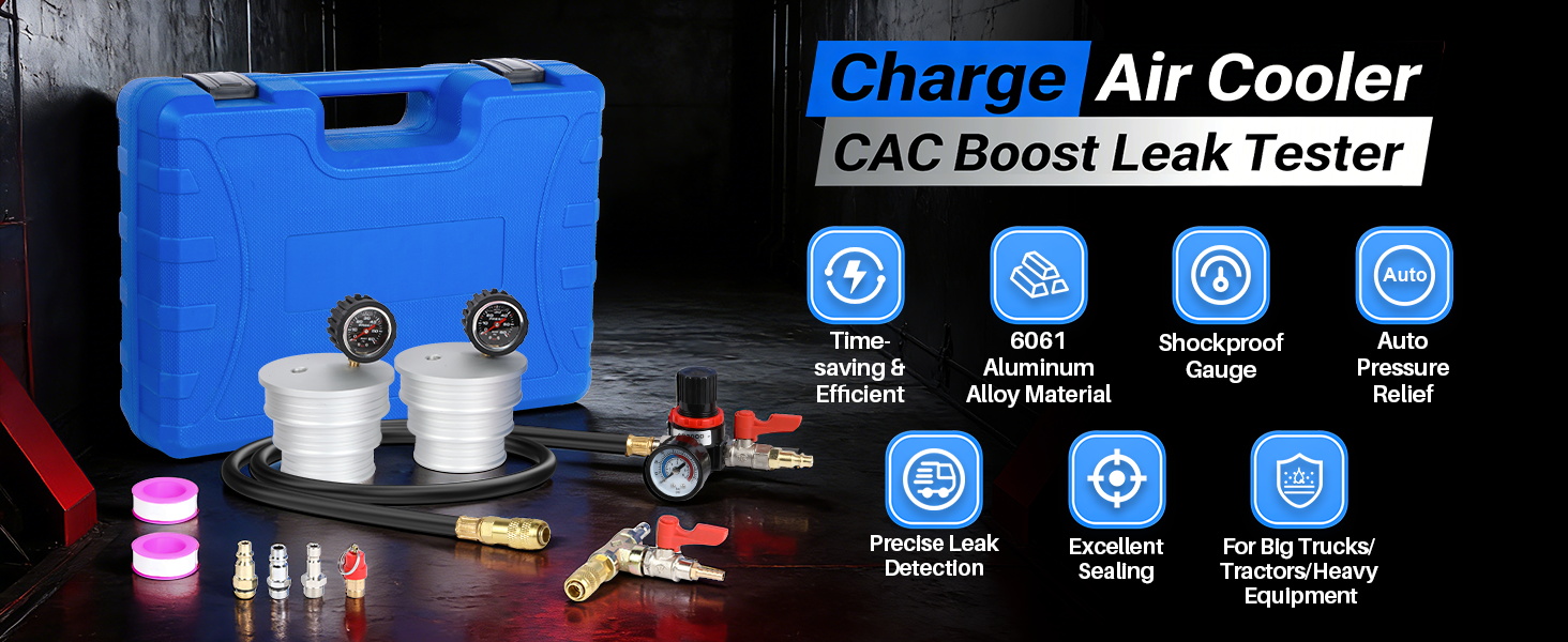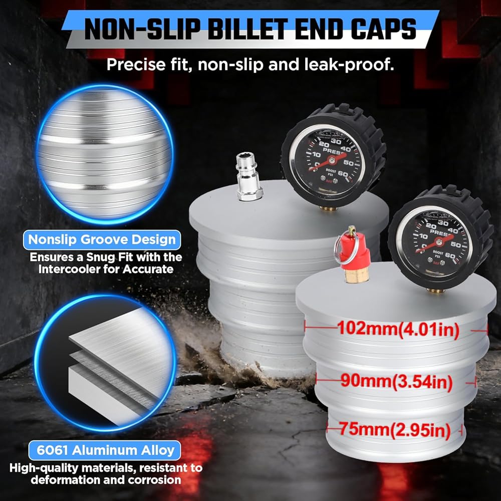 【Heavy-Duty Application & Perfect Fit】Charge air cooler tester kit is ideal for Class 7 and 8 heavy-duty trucks, tractors, and other heavy equipment. The kit includes two stepped anti-slip billet end caps, each designed with three size steps to perfectly match 4-inch, 3.5-inch, and 3-inch pipes. Each step of the billet end cap has an anti-slip groove to enhance the grip, better fit the intercooler hose, and ensure good sealing performance, providing you with accurate and reliable test results.
