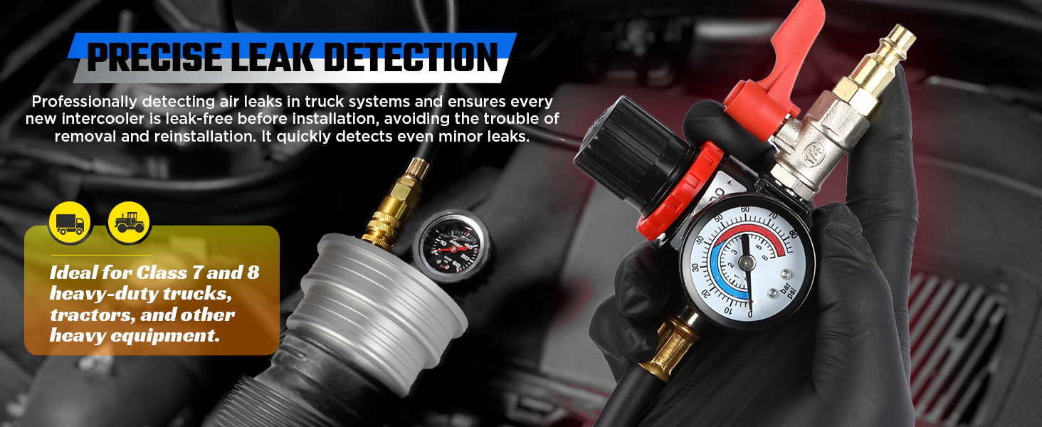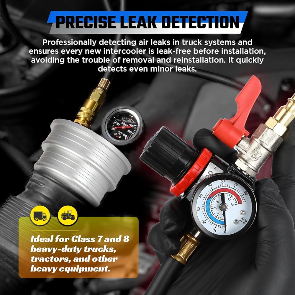 【Boost Leak Tester with Smoke Adapter】This boost leak tester kit professionally detects air leaks in truck systems and comes with a smoke adapter, allowing for easy detection of even small leaks, ensuring reliable testing of various intercoolers and intake systems and accurately locates leak points. Designed to be installed on the hoses on both sides of the intercooler, it is equipped with American and European pneumatic connectors, making it suitable for different installation environments.