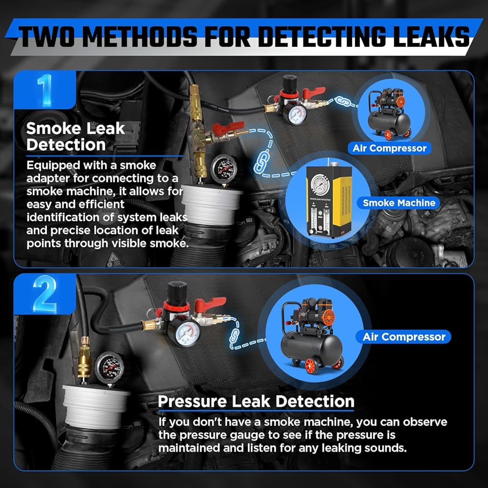 【Two Leak Detection Methods】Our charge air cooler cac boost leak tester offers multiple leak detection methods. It includes a smoke adapter for connecting a smoke machine, allowing for easy and efficient identification of system leaks and precise leak location using visible smoke. If you don't have a smoke machine, you can observe the pressure gauge to see if the pressure is maintained and listen for any leaking sounds.