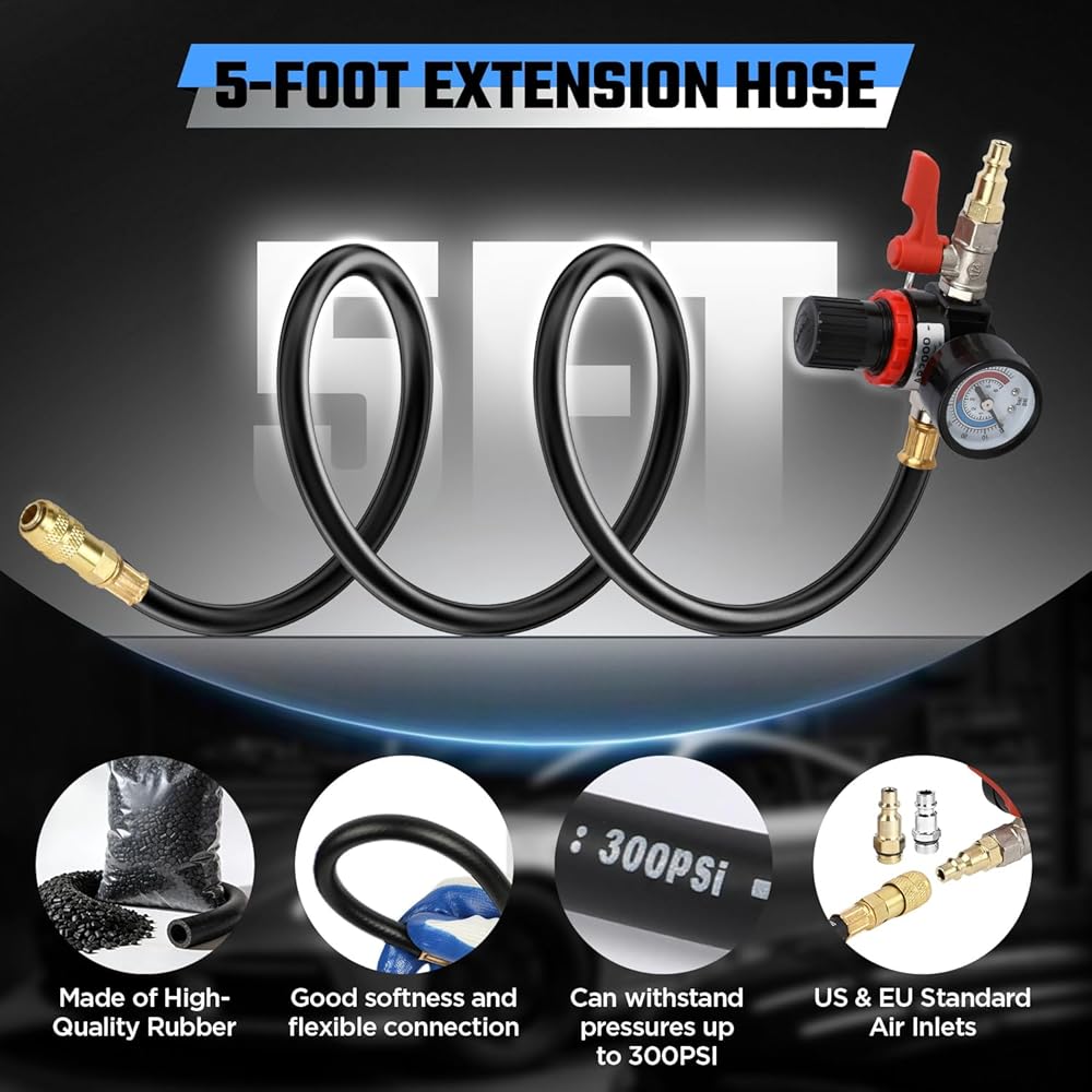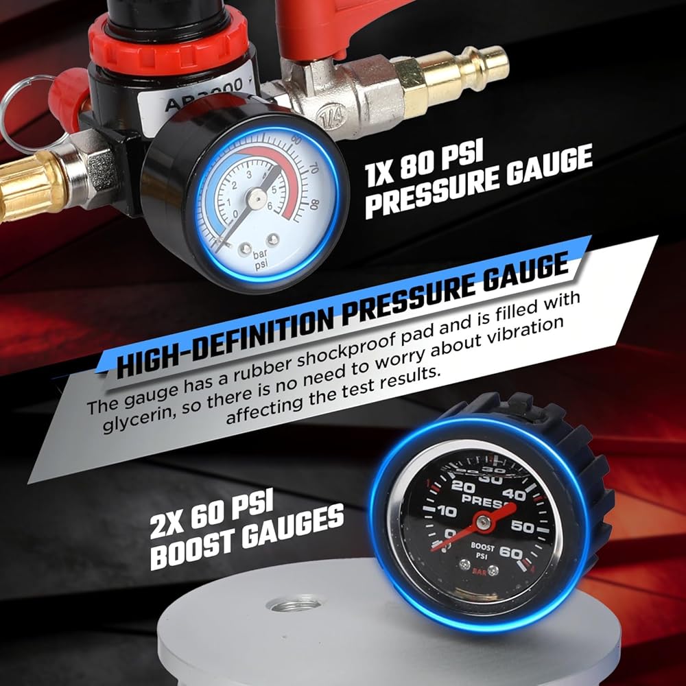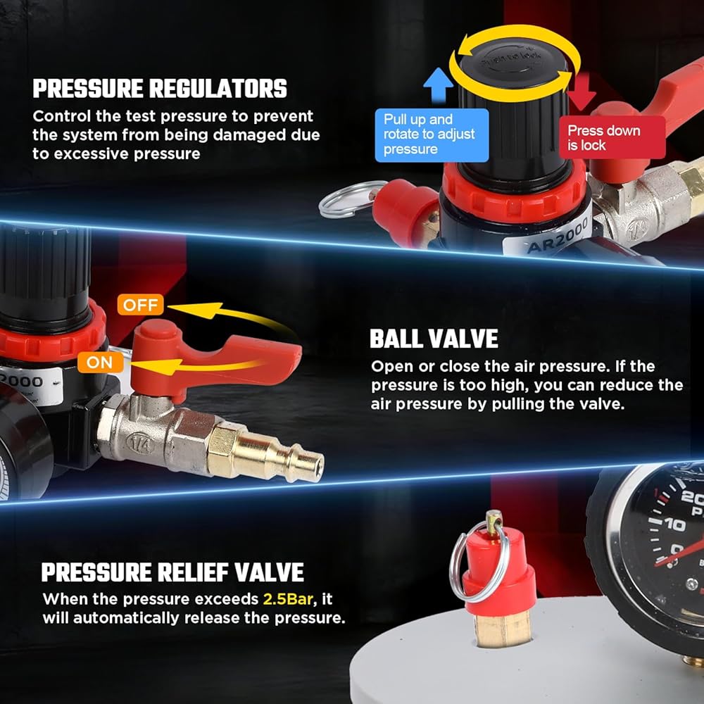 【Pressure Gauge with Pressure Relief Valve and Regulator】The kit comes with a HD 0-10 bar (0-80 psi) pressure gauge with pressure regulator and pressure relief valve, and you can adjust the pressure to the desired level for testing the system. If the pressure is too high, you can reduce the air pressure by pulling the valve (automatic pressure relief when the pressure exceeds 2.5 Bar) to prevent damage to the system due to excessive pressure. (Note: Do not set the pressure above 30 psi)