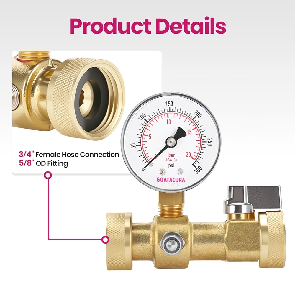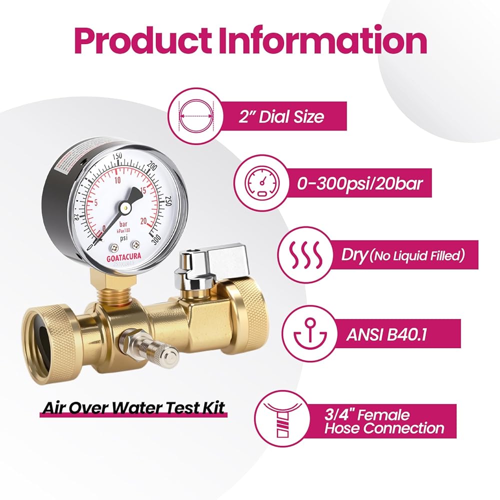 GOATACURA 0-300psi Air Over Water Test Kit, 2” Dial Size, 1/4" NPT Lower Mount, with 3/4” Female Hose Tee Connection for Leak Detection and Pressure Testing