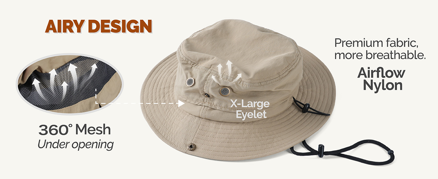 【Breathable Comfort】A sun hat that doesn't breathe can make you sweaty and exhausted in hot weather. This sun hat incorporates multiple ventilation systems, which include Cooling Mesh Lining, 360-degree Vent Openings, Large Metal Eylets and Sweat-absorbing Headband, ensuring your head cool and dry at any time in summer.