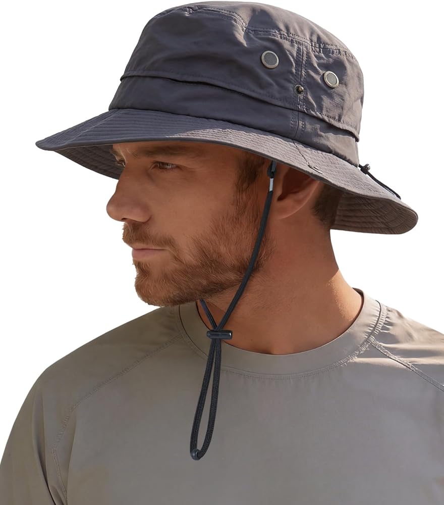 【UPF 50+ Sun Protection】 With the UPF 50+ nylon fabric and a full face coverage from the wide brim, this men's sun hat blocks up to 99% harmful UVA and UVB rays. Ideal for staying sun-safe when you are hiking, fishing, boating or gardening.