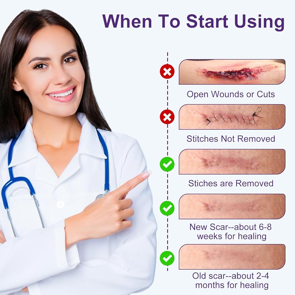When to Start Using: The scar sheets recommended for use on closed scars, and should not beused on open wounds. For optimal results, wear the sheet for at least 12 hours, but no more than 23 hours. Each sheet is reusable.