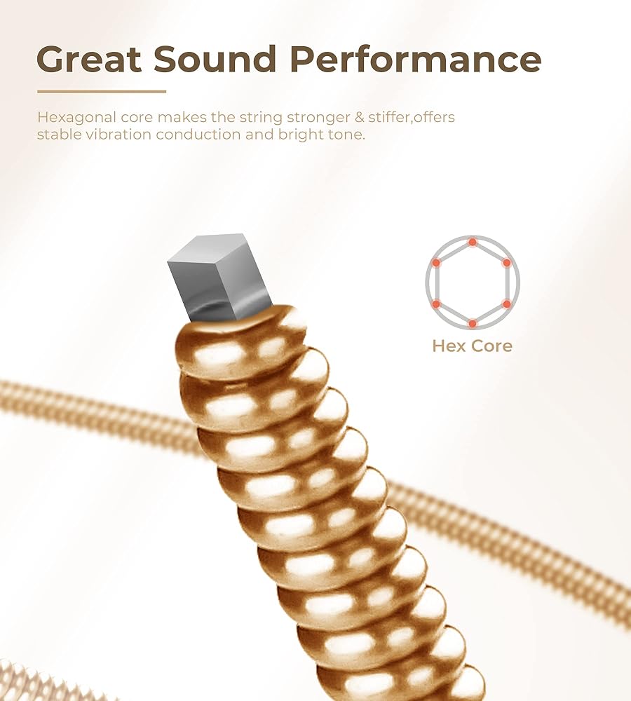✔[Enhanced Durability with Hex Steel Core] The hexagonal carbon steel core enhances the string's durability and stability, providing excellent tension retention and pitch accuracy. These strings are designed to withstand frequent playing without losing their tone or stability, ensuring consistent performance over time