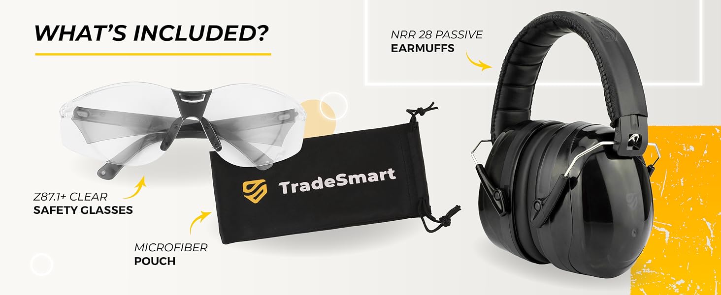 WHAT'S INCLUDED: Get 1x NRR 28 earmuffs for shooting range and 1x clear shooting eye protection glasses, harmoniously color-matched for a unique and stylish look. Plus, an included 1x microfiber pouch for your shooting glasses. Insider tip: This pouch doubles as a lens cleaner! Preserve the anti-fog magic of your shooting eye protection by skipping alcohol. All confidently secured with a 10-year hassle-free warranty provided by TradeSmart LLC. ANSI certified in the U.S. in 2021.