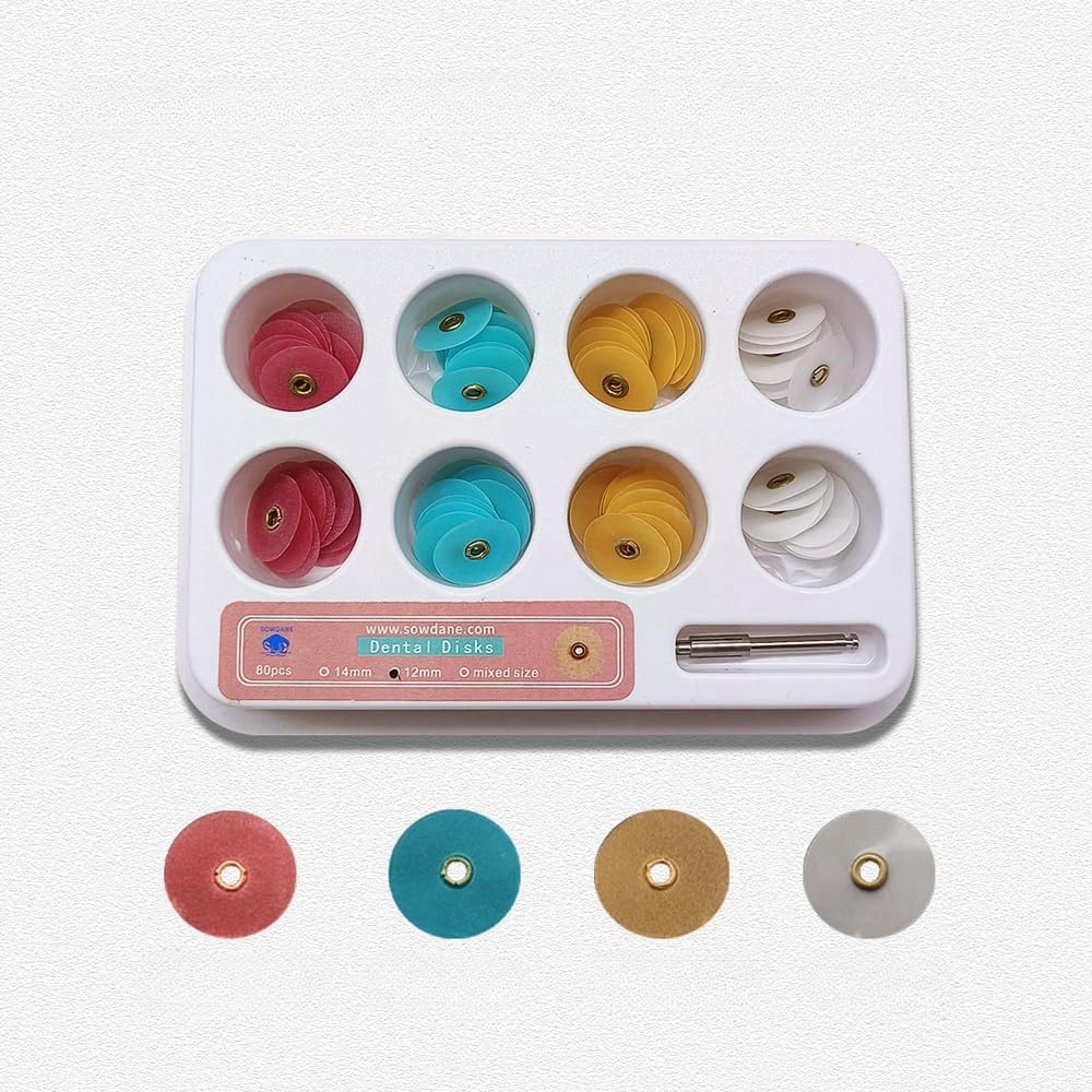 Dental Finishing and Polishing Discs gross reduction contouring Mandrel Stripe ----Polyester polished disc ----There are two sizes for Disc:12mm and 14mm ----Packing: 40pcs/pack or 80pcs/pack ----Black:60μm, Red: 50μm, Yellow: 40μm, Blue: 20μm, White: 9μm