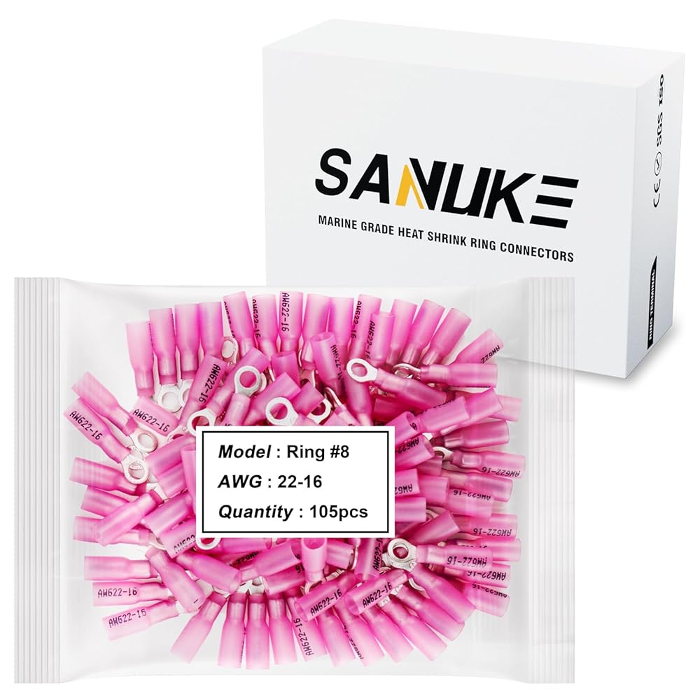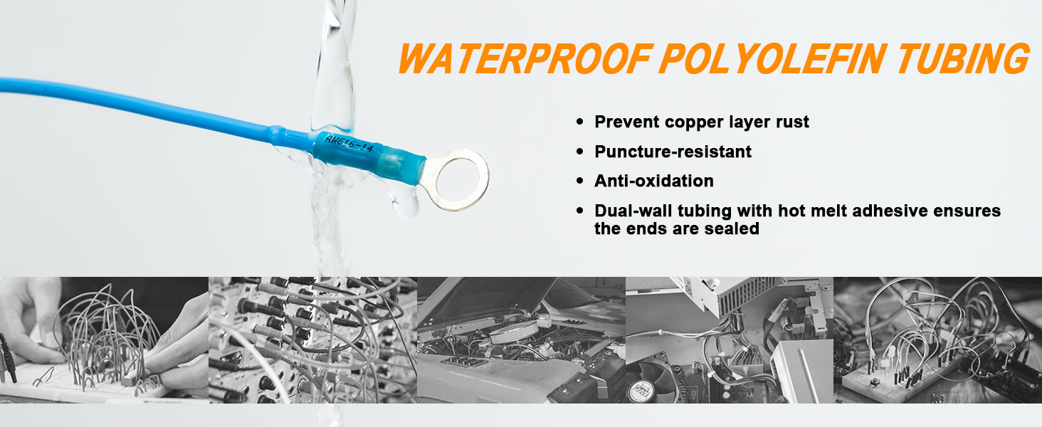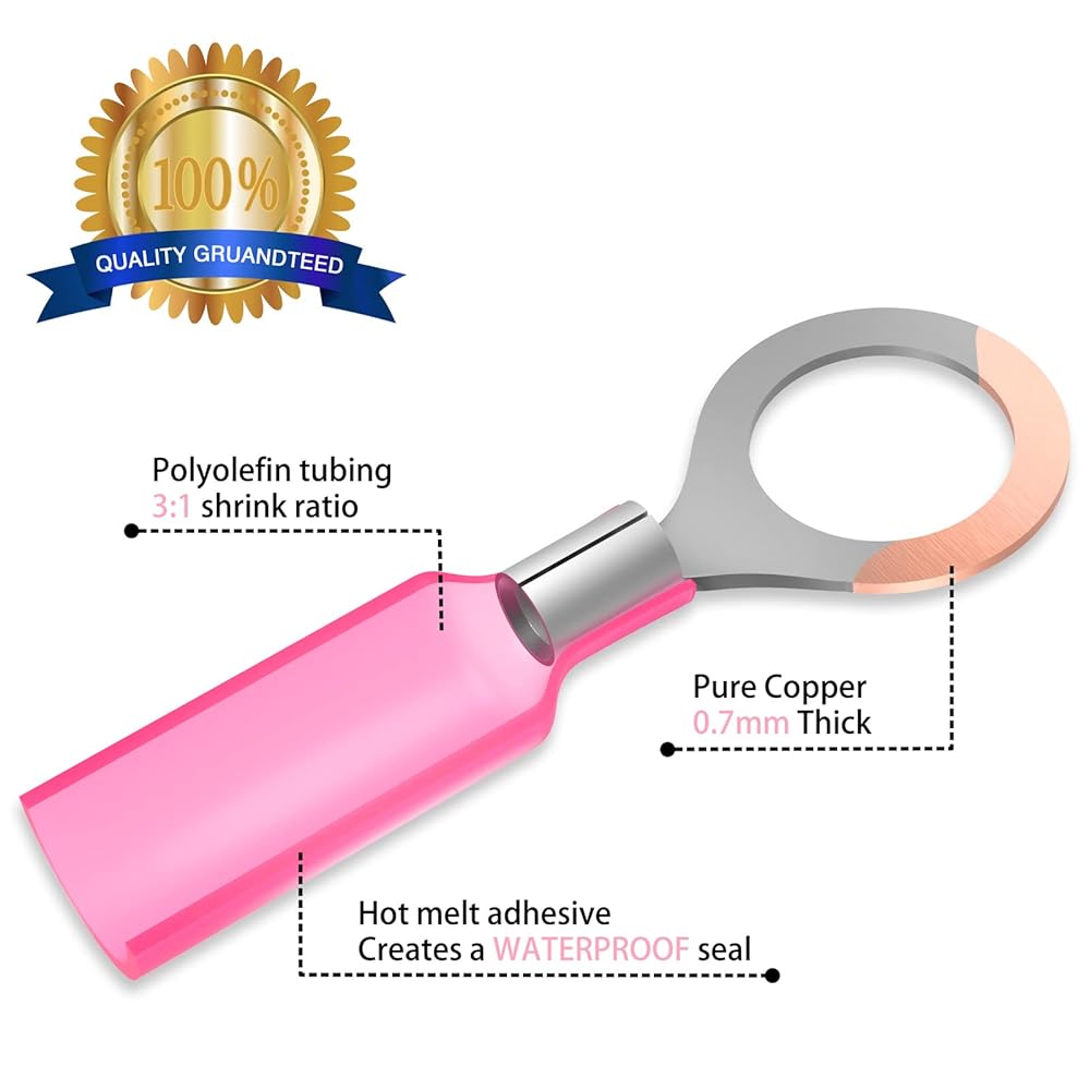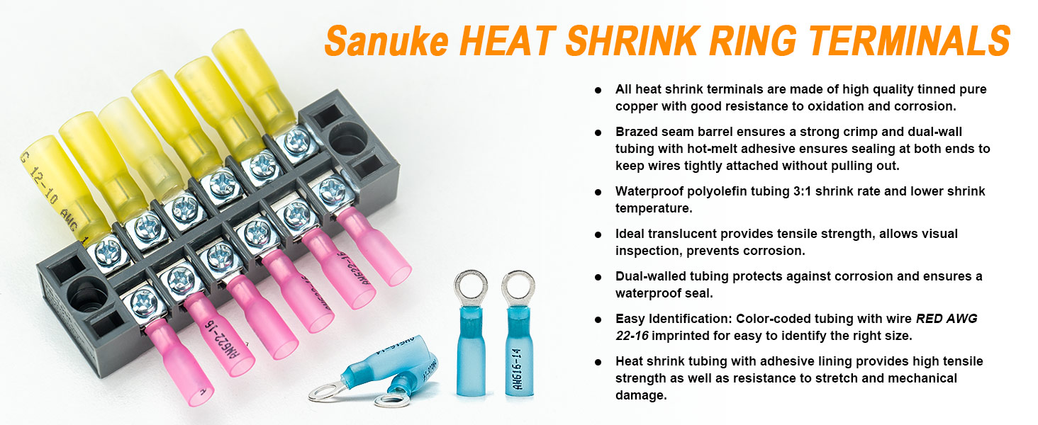 【WIDE APPLICATIONS】These tinned heat shrink ring terminals are safe and reliable, great for distribution box, vehicle, motorcycle, boat, battery, solar panels, home appliances, DIY electrical wire connects etc.