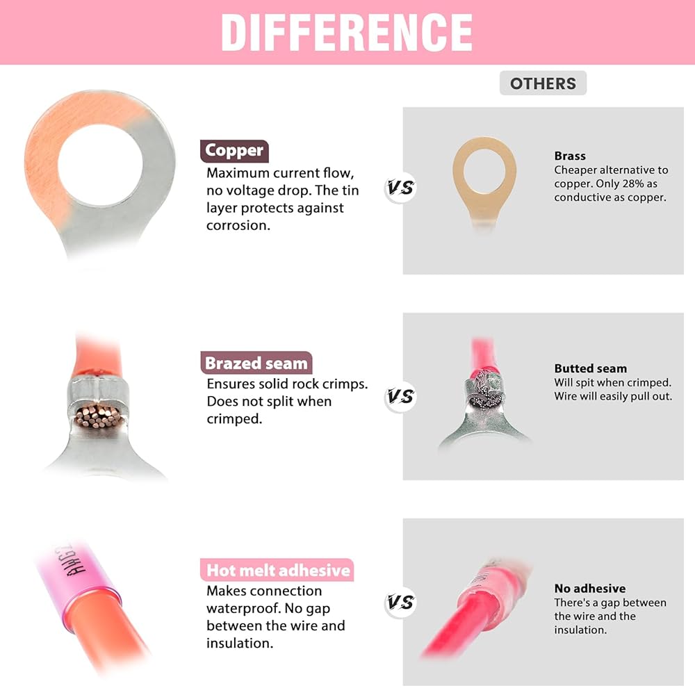 【HIGH QUALITY RING TERMINALS】All the ring terminals are made of pure copper and 0.7mm thick for maximum conductivity. Tinned copper wire connectors also perform well in anti-oxidation and anti-corrosion. And brazed terminal barrel ensures strong crimp and won't let your wire pull out.