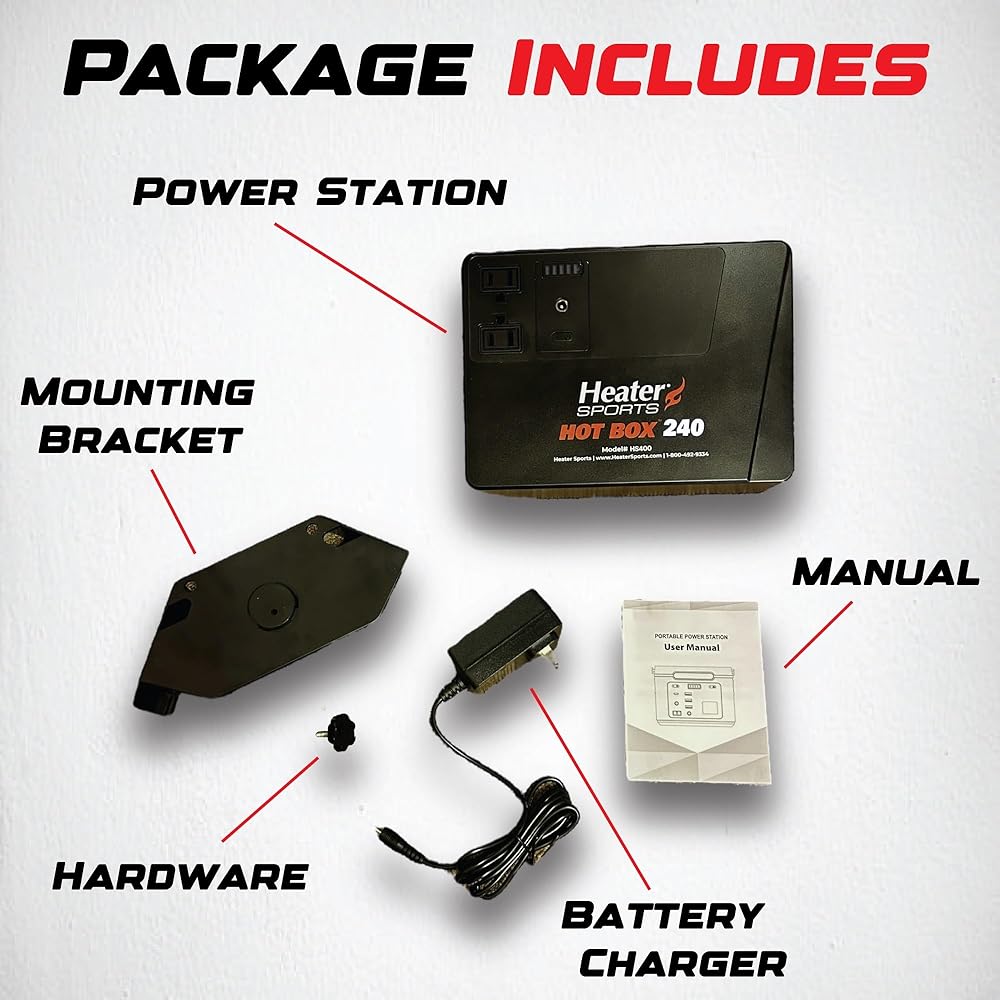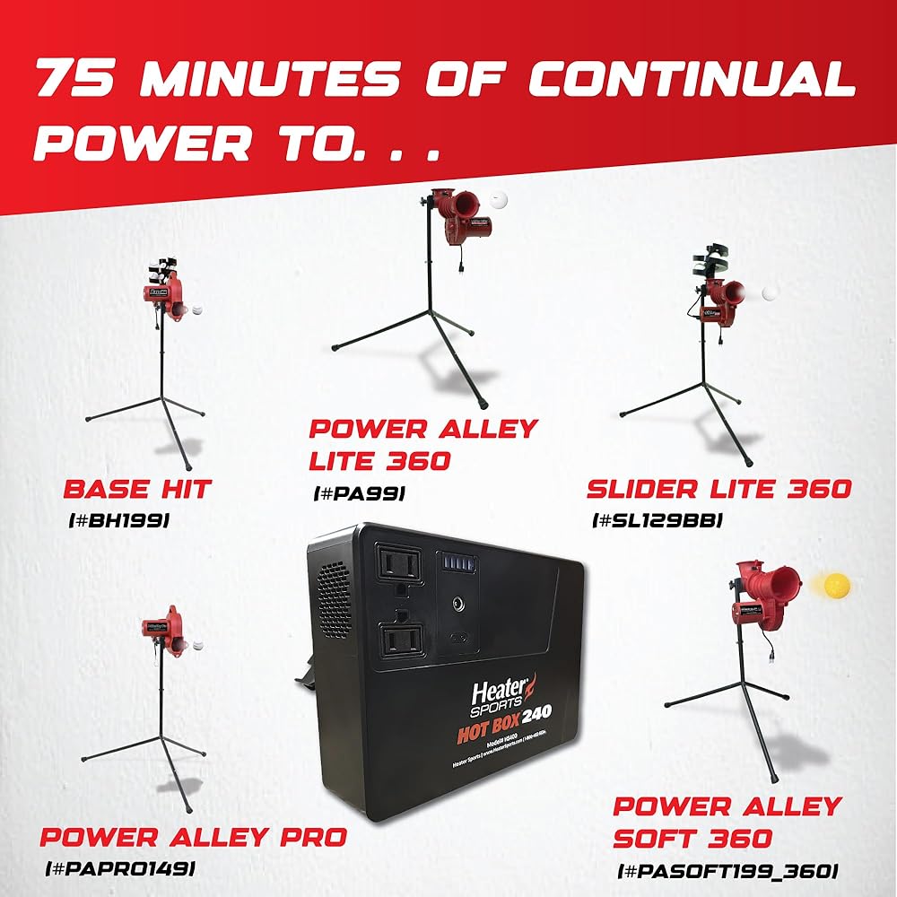 The Hot Box 240 Portable Battery Pack is a great tool for those serious about improving their game while traveling, at the ball field, or at home with limited access to an electrical outlet. The Hot Box 240 is designed to run the following Heater pitching machines for 1.5 hours ran consistently on a full charge: > Power Alley 360 Lite Baseball Machine > Slider 360 Lite Machine > Power Alley Pro Machine > BaseHit Machine > Power Alley 360 12" Softball Machine For other models, please visit the Heater Sports portable power stations page. With a lightweight design at only 4 lbs. and a small compact size of 9" x 6" x 2" the Heater Hot Box 240 is the most convenient battery pack on the market. Hot Box 240's unique feature of attaching directly to the machine's tripod allows you to carry the machine and Hot Box together, making transportation, use, and convenience priority. Hot Box 240 includes dual A/C outlets to plug your pitching machine into and a simple on/off switch to power it up. As it runs, the digital LCD displays the remaining battery power life so you know exactly how much time is left before a recharge is needed. To recharge, simply plug the provided adapter into the Hot Box and the opposite end into your A/C outlet plug at home. Within 4 hours the Hot Box will fully recharge and be ready to use again. The Hot Box can be used for other applications as well such as charging your phone, tablet, laptop, and many more items for multi-use convenience.