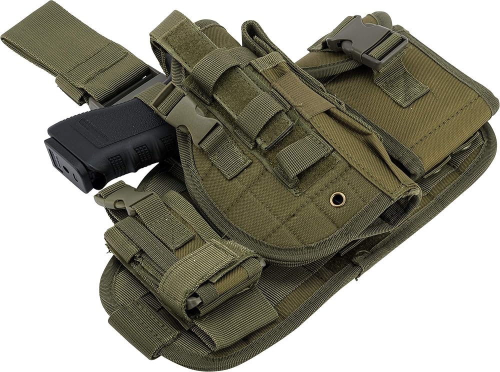 The Matrix Drop Leg MOLLE platform is a versatile tactical solution completed with a modular universal holster with integrated mag pouch, a mag pouch and a small accessory / hand-cuff sized pouch. Other feature includes non-slip strap, adjustable buckles, quick draw ready and much more. Universally fitting most pistol framed equipment, the Matrix Drop Leg system will provide Belt, Drop Leg, and MOLLE mounting holster to meet all your critical Airsoft Event Gaming needs.