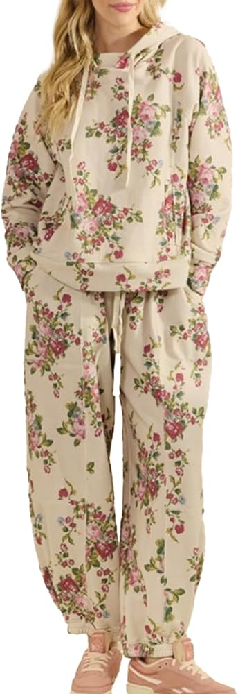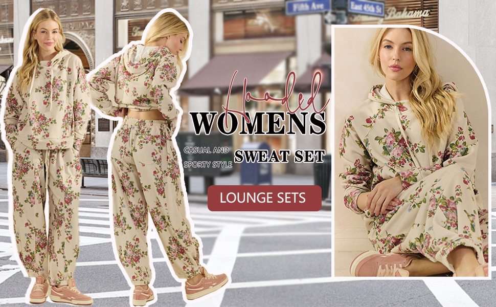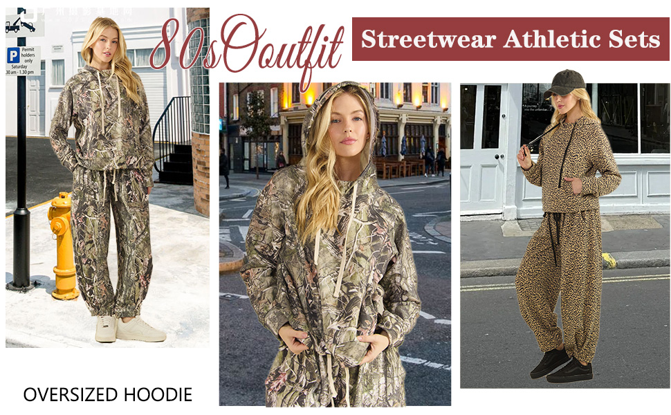 Feature: Sweat set, print, sweatshirt, oversized hoodie, lace up, baggy sweatpants, wide leg, with pockets, showing casual and sporty style. Fall outfits/ 80s outfit/ athletic romper/ workout sets/ vacation outfits/ athleisure sets/ casual outfits/ disco outfit/ cute outfits/ active wear.