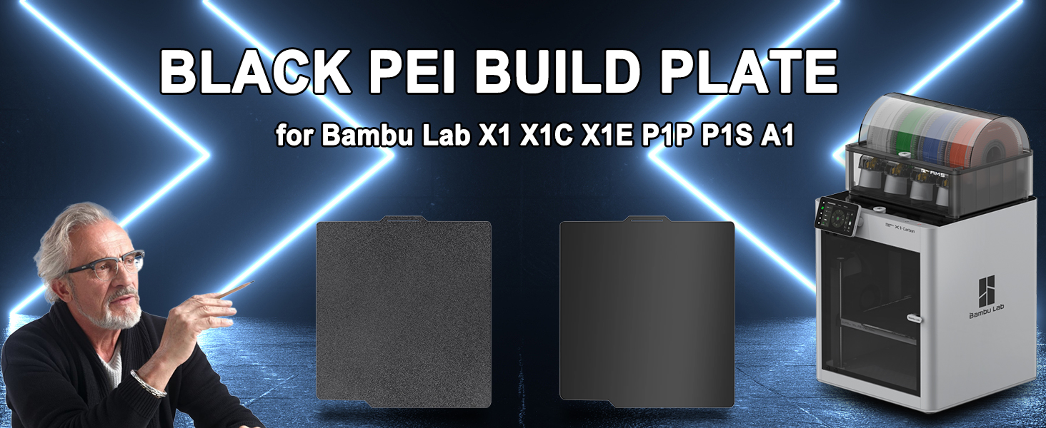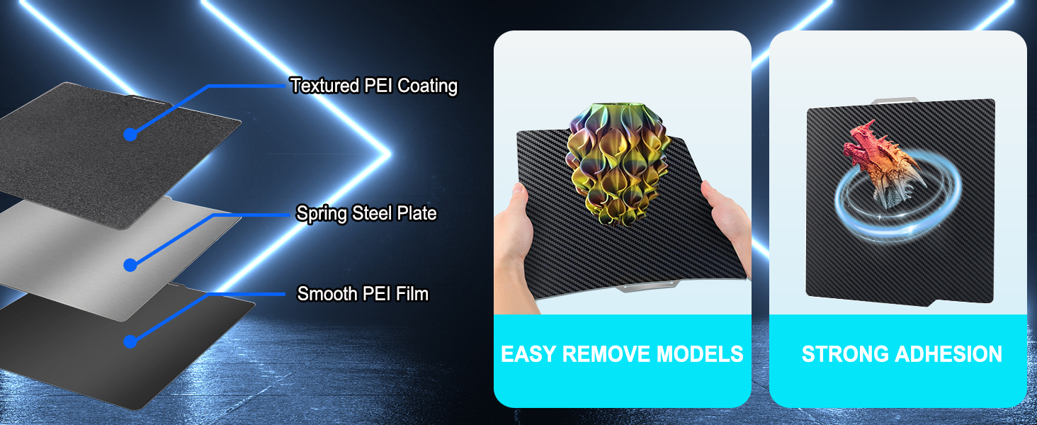 Double Sided Smooth PEI+Textured PEI Build Plate: One side is black smooth PEI print bed surface, the bottom of the printed model is smooth, the other side is black PEI frosted surface plate, presenting the frosted sticker surface a distinctive frosted touch, provides greater adherence to the model and prints without warping