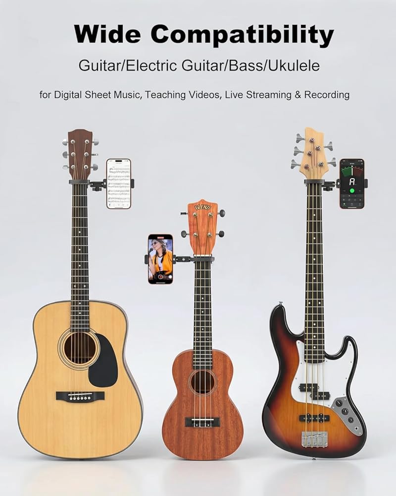 【Silicone Pads for Grip & Protection】The guitar phone holder mount includes soft silicone padding to prevent slipping and protect your guitar neck from scratches or clamp marks, ensuring secure and gentle hold