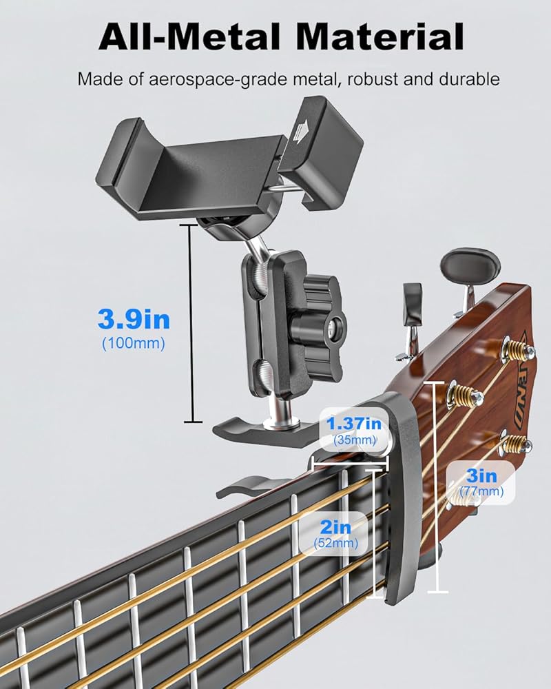 Guitar Capo with Phone Holder [Precise Tuning] All Metal Guitar Phone Holder for Electric Guitar/Bass/Ukulele, 360° Adjustable Guitar Phone Mount for iPhone 17 Pro Max 16 15 Ai Plus