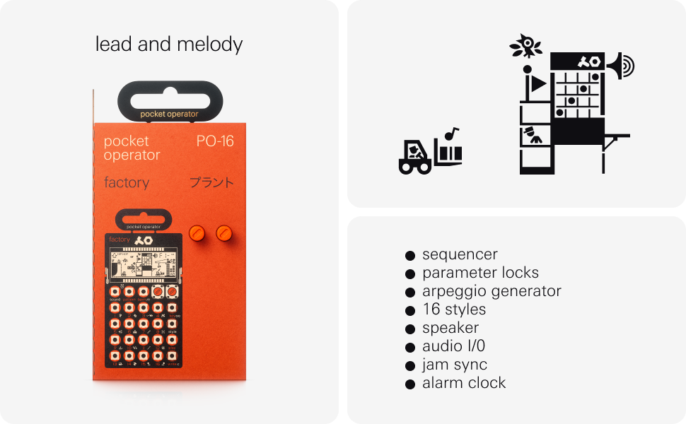 a wall of sound in your pocket – pocket operators are small and ultra-portable music devices that can be used individually, together, or with other compatible gear. each edition is battery powered (2xAAA) with 1 month battery life and 2 year standby time. you'll also find a folding stand, clock and alarm clock function.