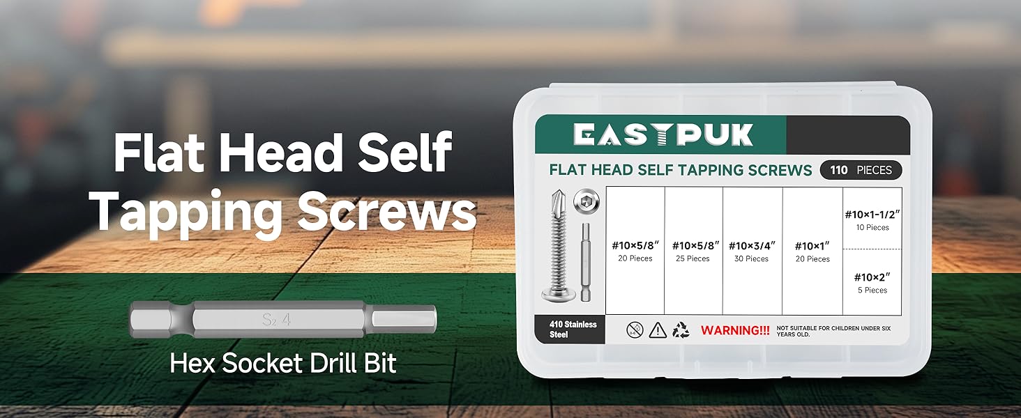 110Pcs #10 Sheet Metal Screws Assortment Kit, Stainless Steel Flat Head Socket Cap Self Drilling Screw, Allen Socket Drive, Self Tapping Screws with Drill Bit