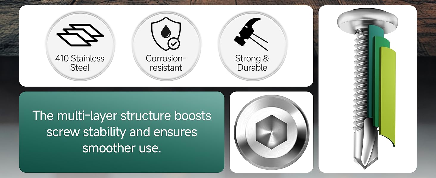 Durable & Reliable – These self-tapping screws are made from 410 stainless steel, providing corrosion resistance and rust protection. These self tapping screws for metal are designed for long-lasting performance and high strength, offering greater resistance to damage and a strong, secure hold. (Note: 410 stainless steel sheet metal screws are magnetic.)