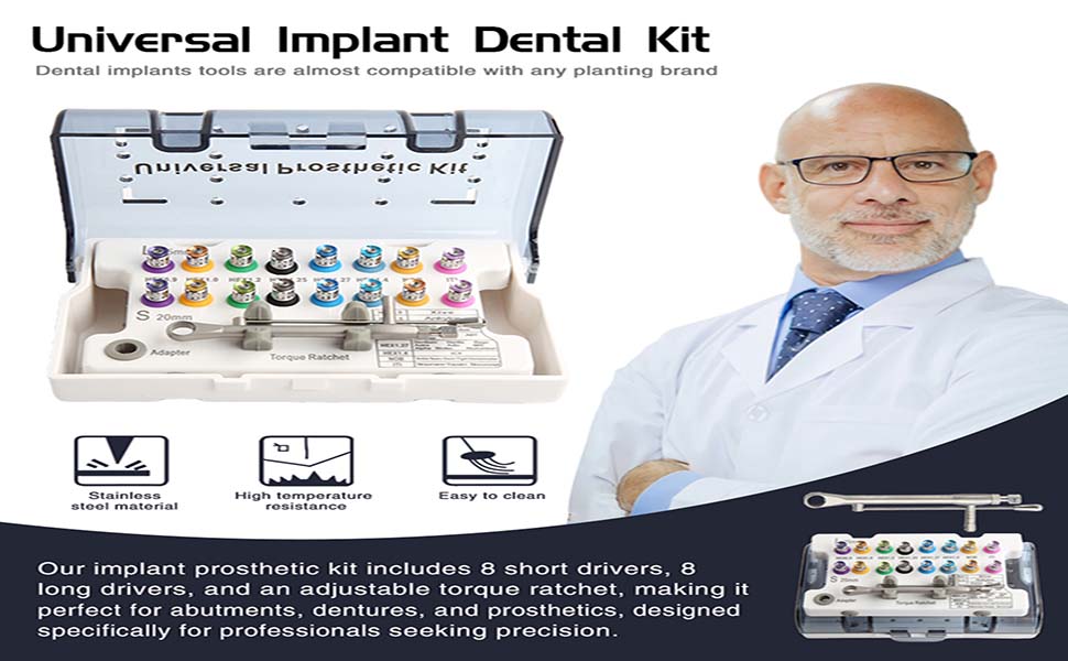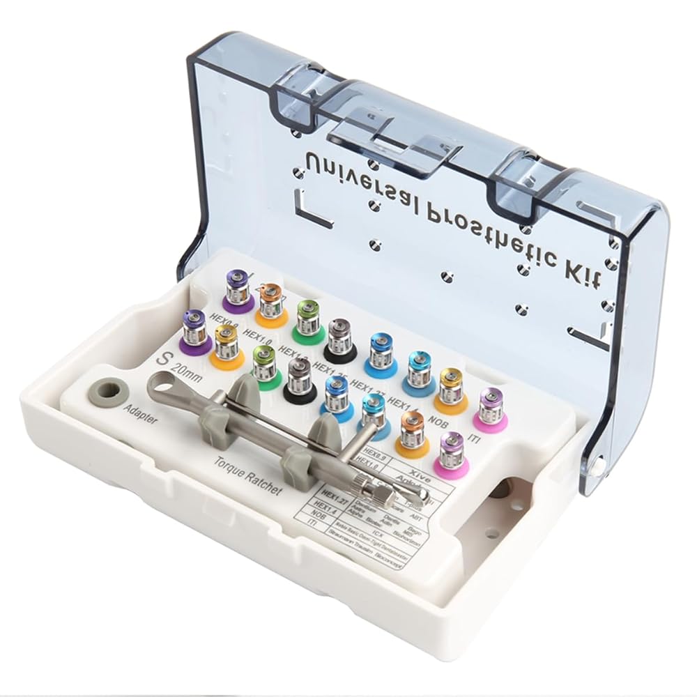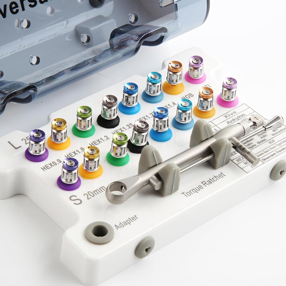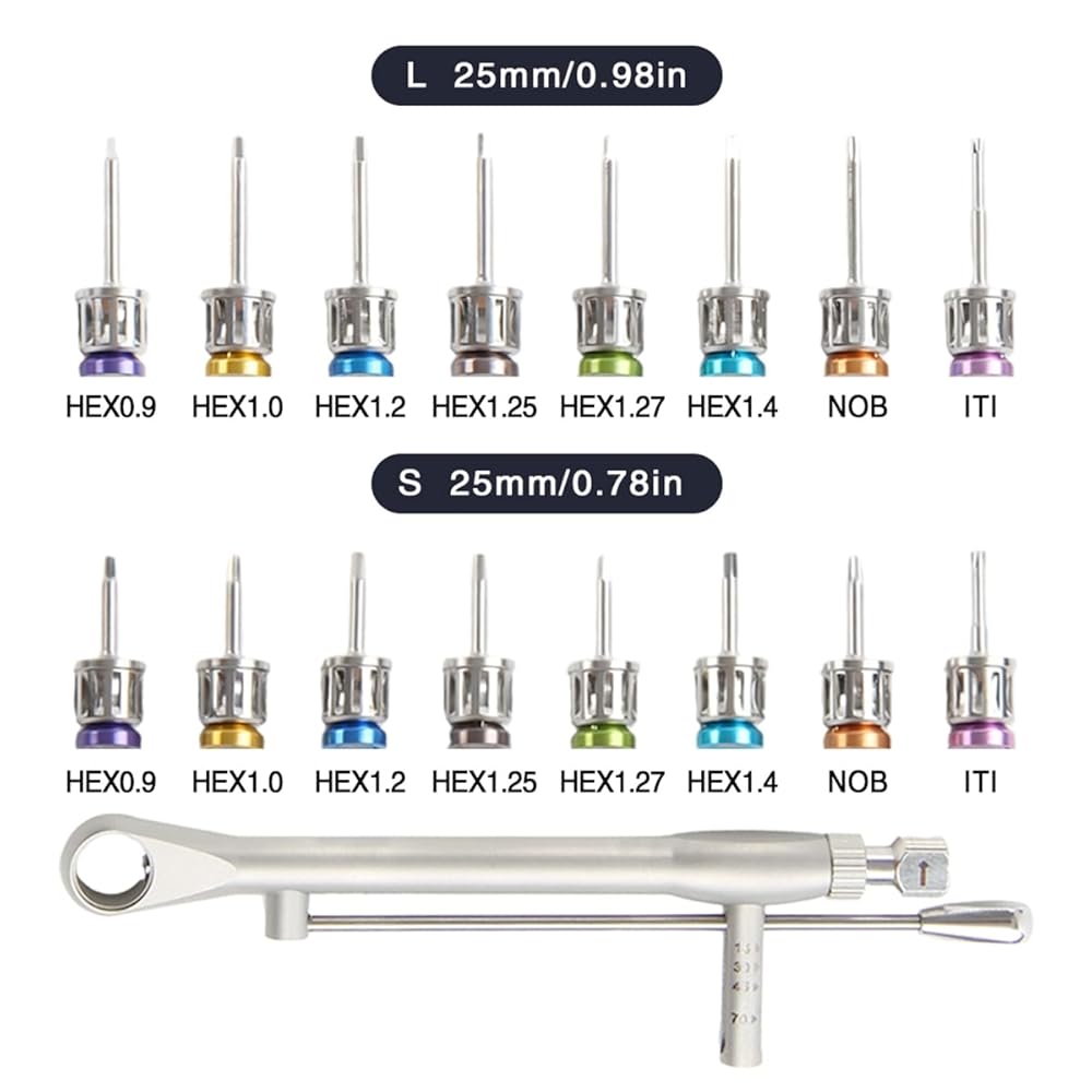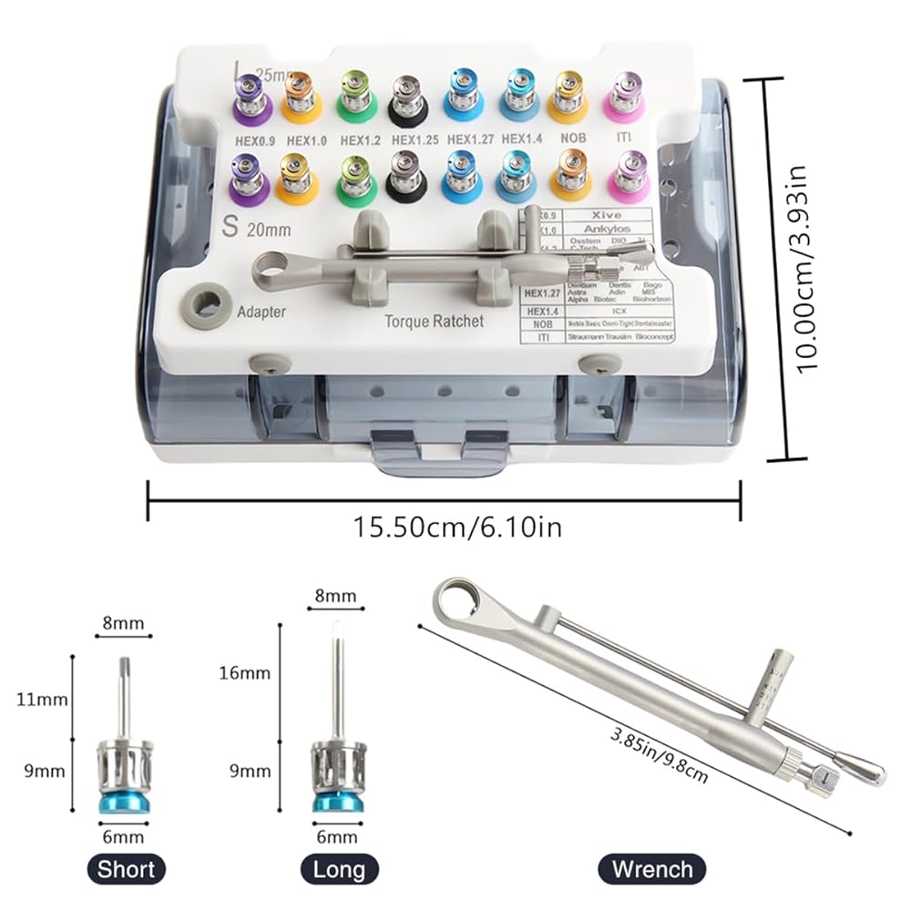 Rich Muite:Universal implant prosthodontic driver kit 8 short(8.5mm)and 8 long shanks(13.5mm),the torque wrench range of 10-70ncm,and storage case for organized workflow.