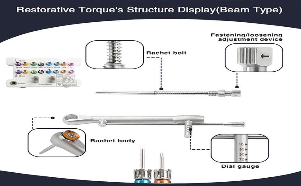 Versatile Compatibility:Dental implant torque wrench set is used to secure or remove implant and to tighten or loosen screws according to the correct torque value,The screwdriver and the base are marked with different colors, which is convenient to quickly identify the size and improve work efficiency.