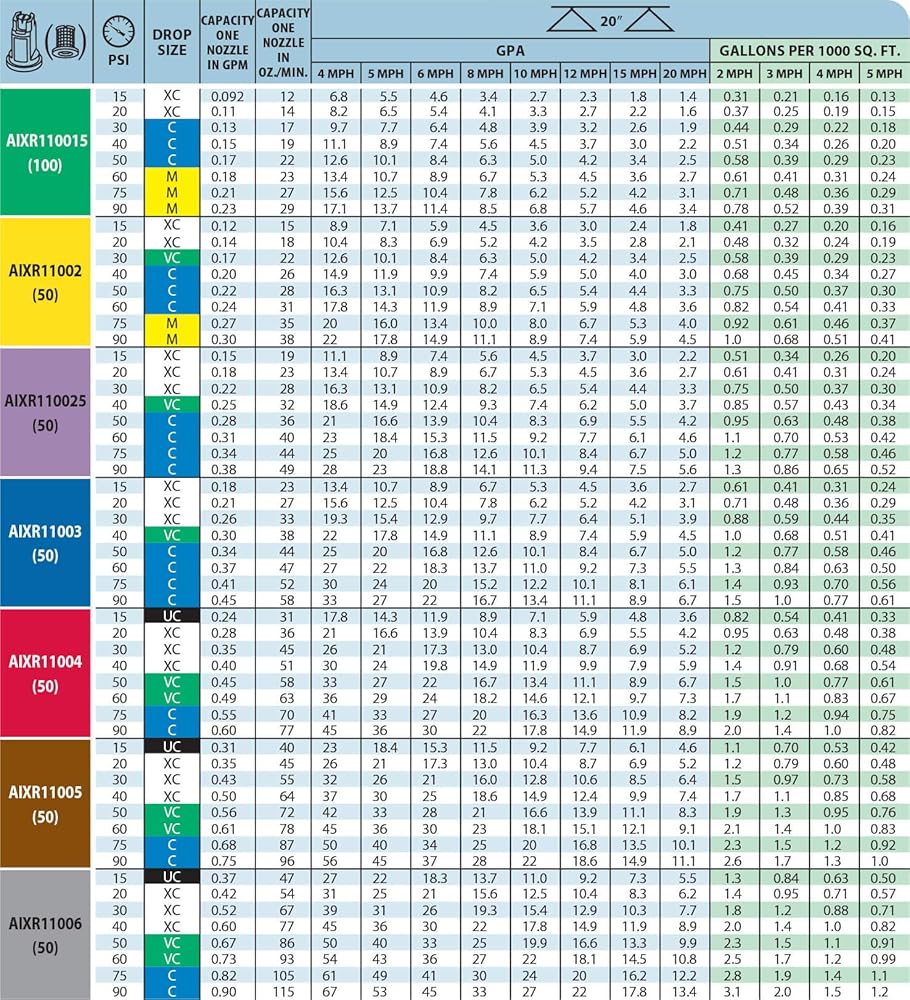 See Chart in Pictures for PSI Ratings! Pack of 6 - AIXR11005-VP Air Induction Flat Spray Nozzle. 110° wide, tapered flat spray angle with air induction technology offers better drift management. Made of a two-piece UHMWPE polymer construction with VisiFlo color-coding. UHMWPE provides excellent chemical resistance, including acids, as well as exceptional wear life. Compact size to prevent tip damage. Depending on the chemical, produces large air-filled drops through a Venturi air aspirator. Removable pre-orifice. Available in seven tip capacities with a wide operating pressure range: 15-90 psi (1-6 bar).