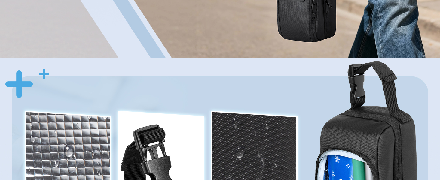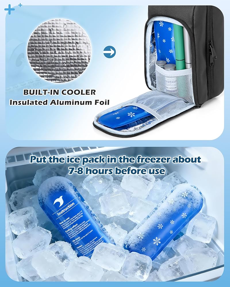 BUILT-IN COOLER: The front insulated aluminum foil pocket with 2 reusable ice packs to keep insulin pens and vials at a stable temperature during transport.