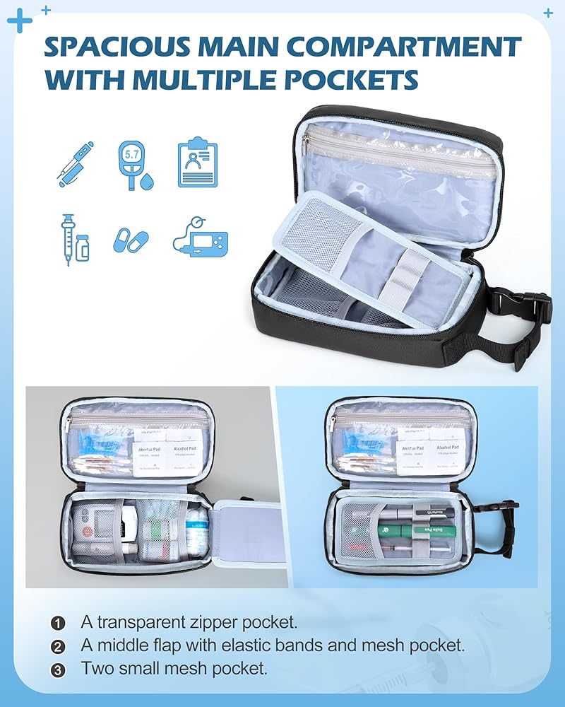 LARGE CAPACITY: Spacious interior with multiple pockets easily accommodates a glucose meter, testing strips, insulin pens, vials and other diabetic accessories.