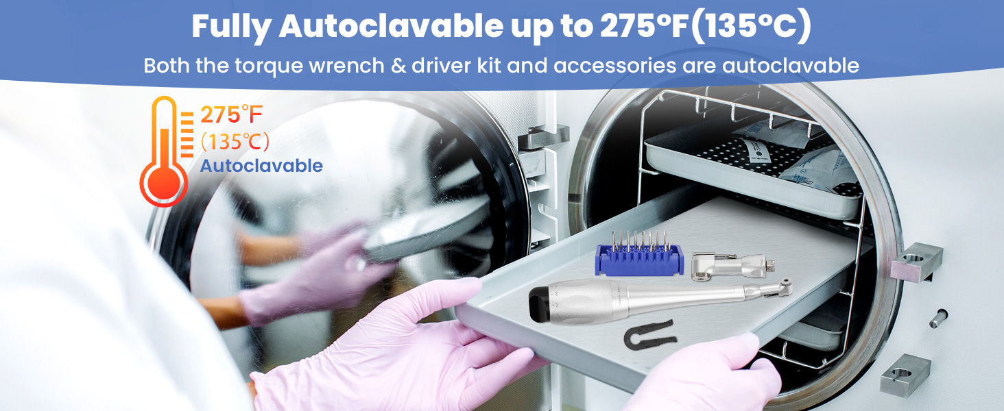 Quality Dental Tools: Dental hex screwdriver and torque wrench, made from high-quality aluminum alloy, offer excellent durability and corrosion resistance. Both tools are autoclavable up to 275℉, ensuring a hygienic and safe environment for dental work while minimizing contamination