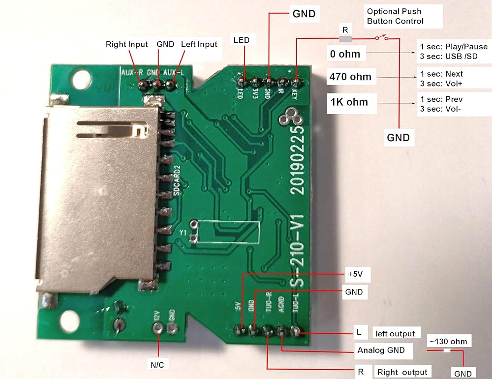 This mp3 board module has both USB and full size SD card interface, stereo inputs and stereo outputs.