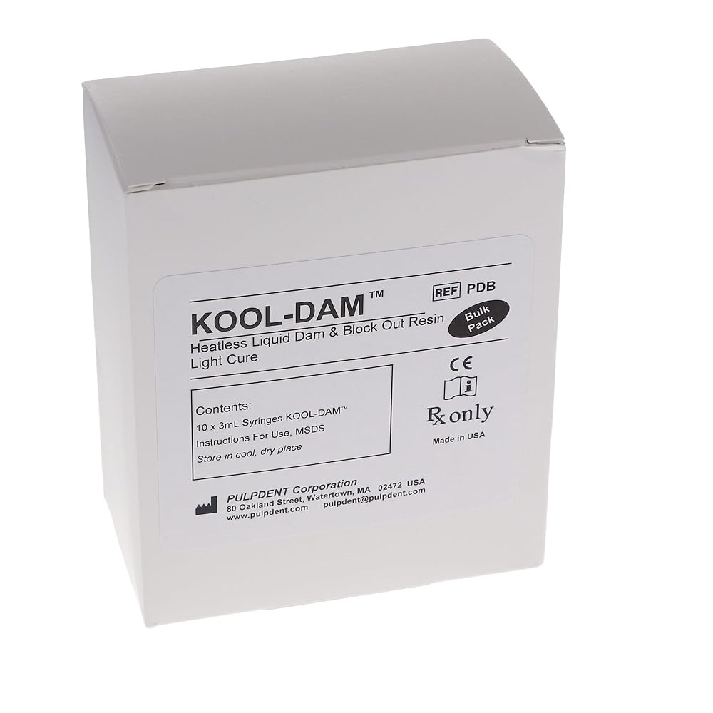 Kool Dam - Bulk Kit - Light Cured Heatless Liquid Dam Material for Protecting Gingivae. Kit Contains: 10 - 3 mL Syringes. Applied on tooth surface and gums for intraoral protection. High adaptability even in the presence of moisture. Remains cool for patient comfort. Outstanding tear-resistance for easy removal. Kool-Dam Heatless Liquid Dam and Block-out Resin provide needed intraoral protection to the tooth surface and gingiva before bleaching, sandblasting, and other dental procedures. Kool-Dam adapts well in a moist oral environment and remains in place.It supports perfectly even stacking, blocking undercuts before impression taking.The fast light cure property allows it to stay cool after curing for increased patient comfort and convenience.Kool-Dam is resistant to tear for effortless removal and lasting flexibility post-curing. Its unique composition results in adherence to models for bleaching trays.Each Kool Dam Bulk Pack 10 (3 ml) Syringes.