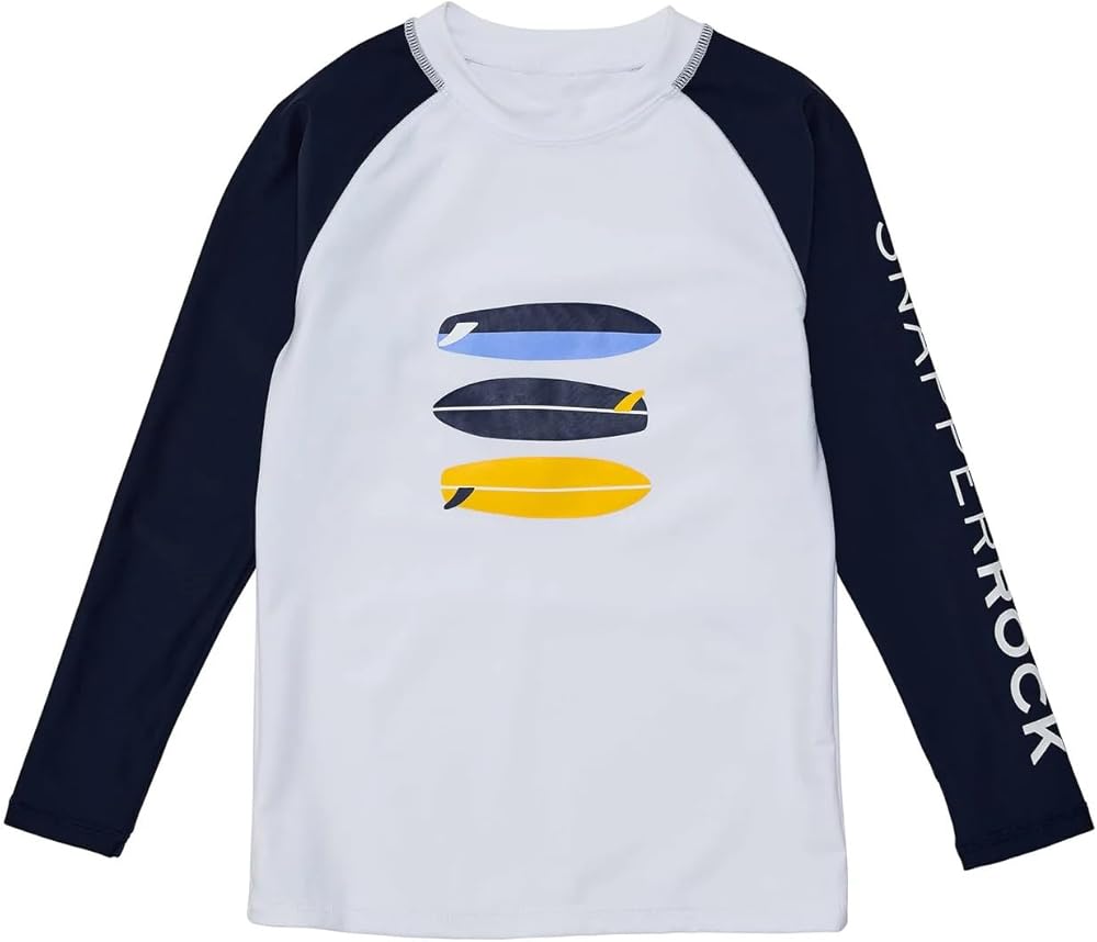 Dive into the waves with our rash guard top, featuring a pristine white body, retro surfboard print, and striking navy sleeves. It provides UPF protection, ensuring endless beach fun and parental peace of mind. Ideal for kids who love splashing and surfing, this top is a must-have for sun protection.