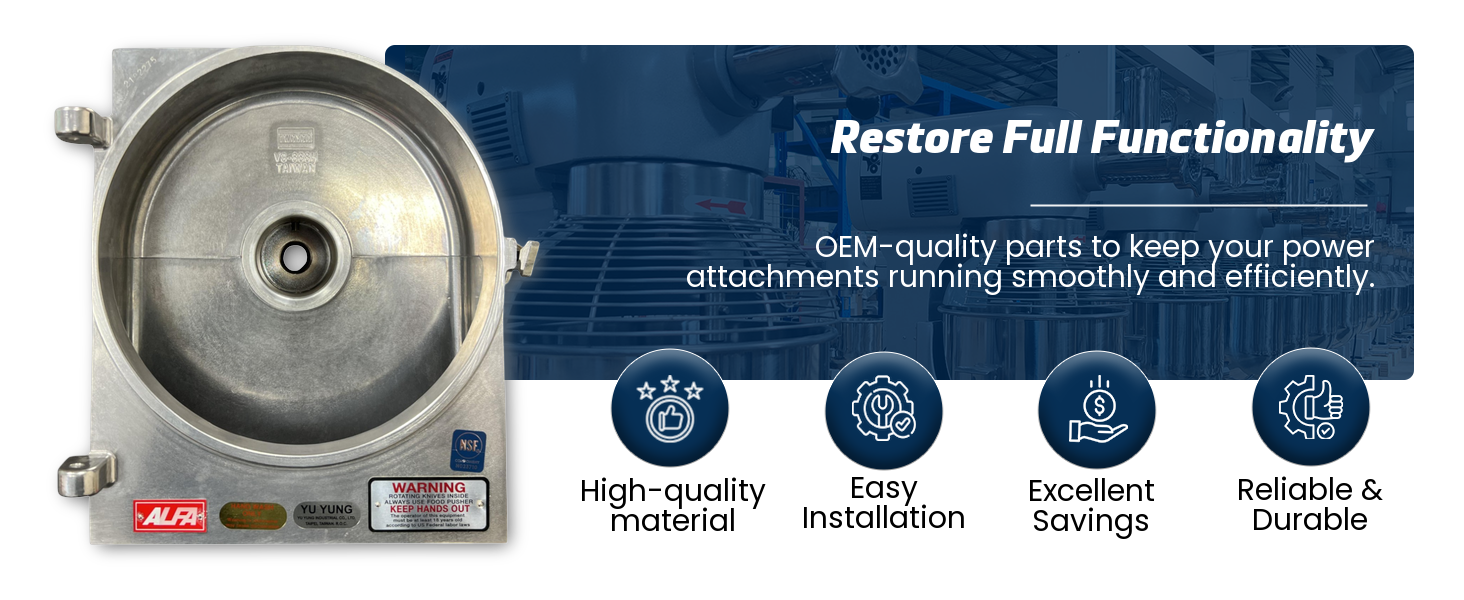 High-Quality Construction: Crafted from heavy-gauge polished aluminum, the ALFA VS-99H Housing ensures superior durability and longevity, making it an excellent choice for demanding commercial kitchen environments. Its robust design is built to withstand regular use, providing a reliable foundation for your food processing equipment.