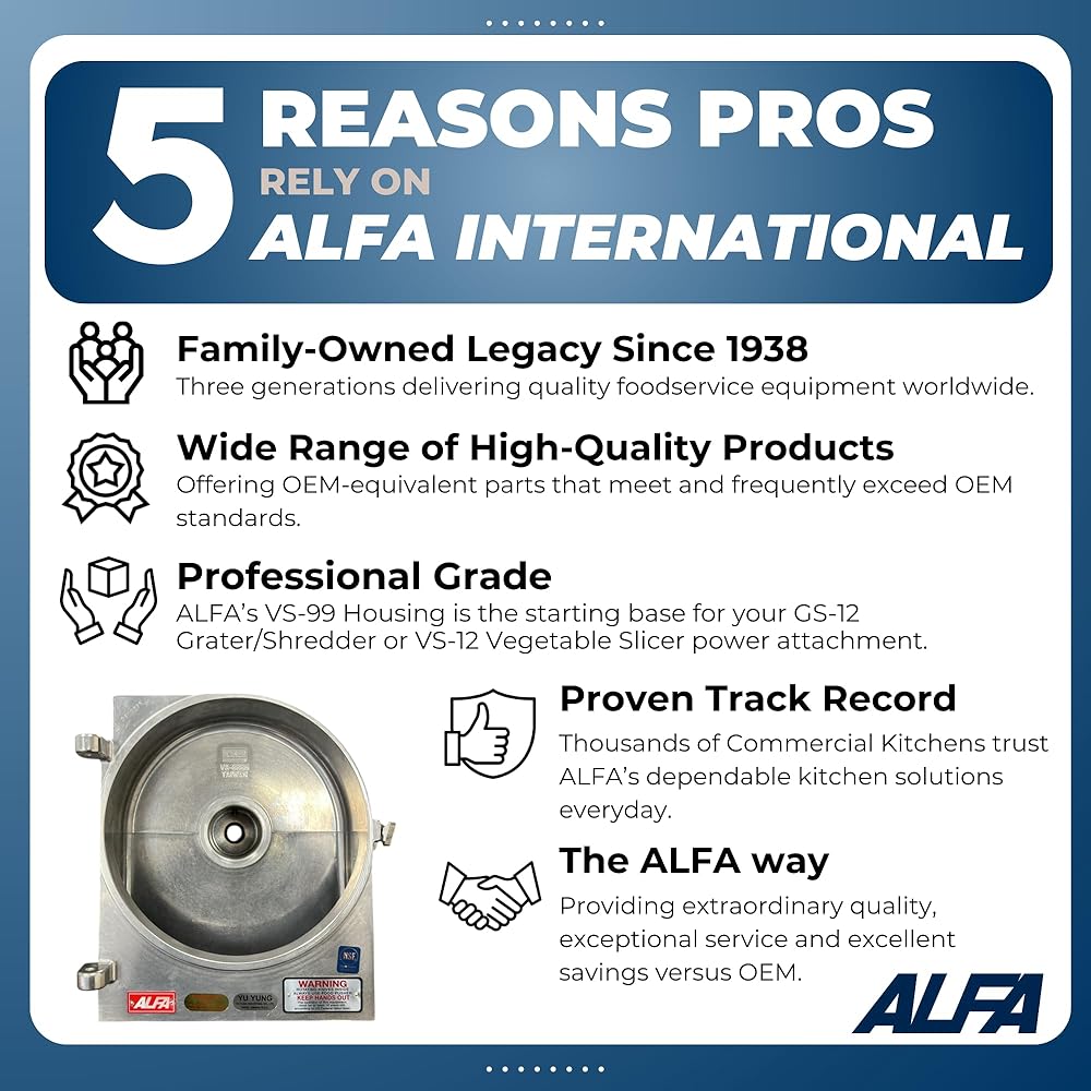 Versatile Compatibility: Designed to fit size #12 Hobart VS9 power attachments, the VS-99H Housing allows for easy integration with ALFA's VS-12DH Disk Holder or VS-12KDS Slicer Knife Assembly. This versatility means you can upgrade your existing setup without any hassle, enhancing your food preparation capabilities with top-quality aftermarket parts.