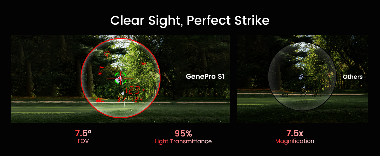【Crystal-Clear Visuals, Adaptive to Any Light】With SmartDisplay, GenePro S1 adapts to changing light conditions—automatically switching between red and black displays for optimal contrast. Paired with 7.5x magnification, a 7.5° field of view, and over 95% light transmission, your target stays sharp from dawn tee-offs to dusk finishes.