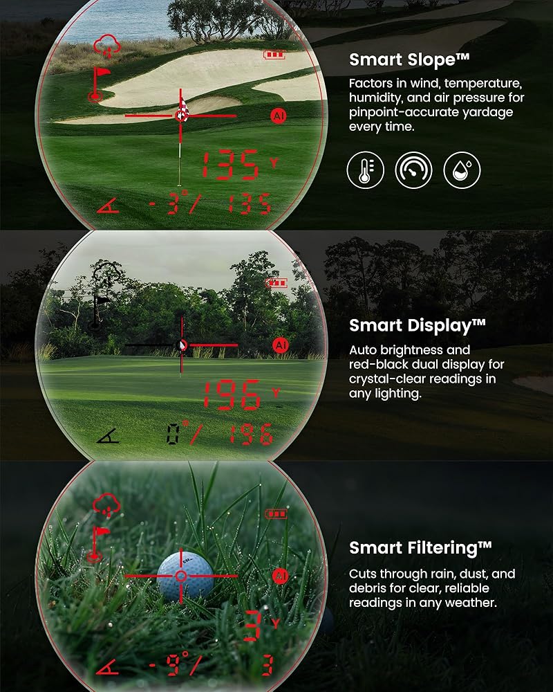 【AI-Powered Precision – The Smarter Golf Rangefinder】GenePro S1 is the world's first AI-integrated Golf Rangefinder. Powered by SmartSlope, it auto-detects slope, wind, temperature, humidity, barometric pressure, and elevation to determine the most precise compensated distances. Whether uphill, foggy, or breezy—this AI Laser Range Finder helps you choose the right club, every time.