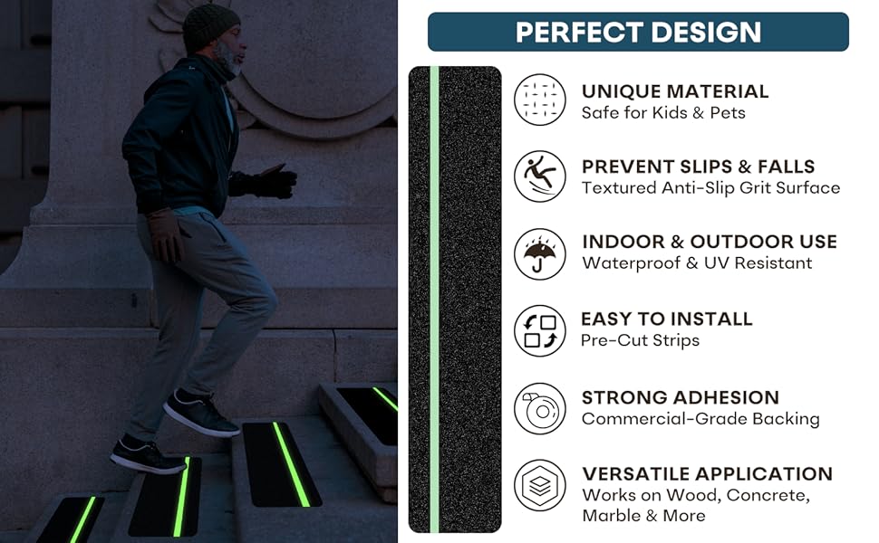 Glow in Dark Stripe Anti Slip Tape — 6 inch X 30 inch (10-Pack) Glow in the dark anti-slip tape, Each tread features a photoluminescent stripe. Photoluminescent stripe absorbs light during the day and emits a gentle glow for hours, helping prevent trips and slips at night or during power outages.