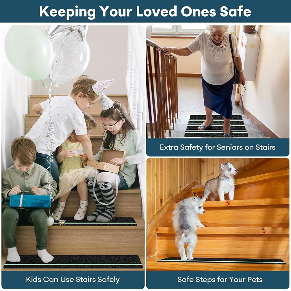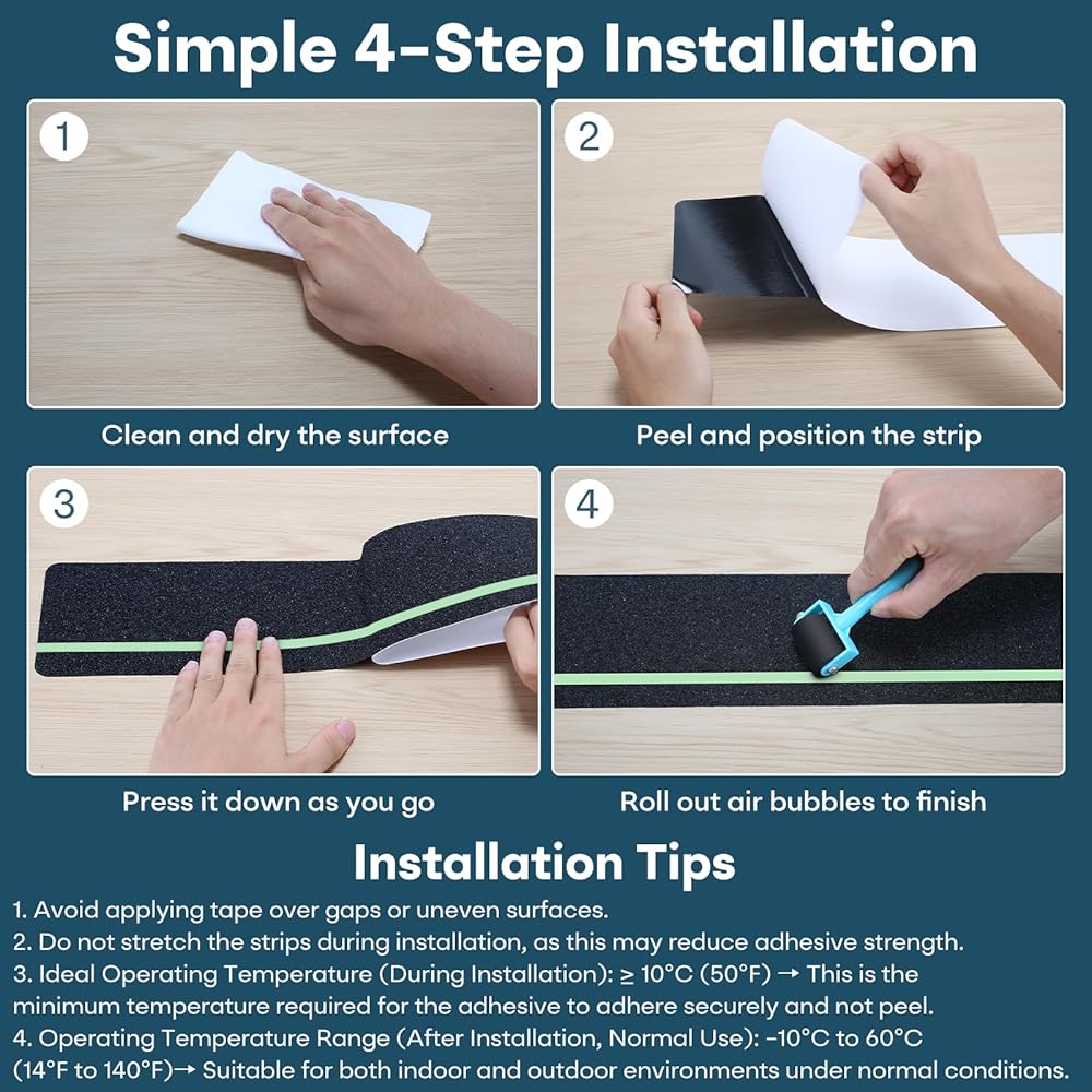 Safety & Traction — Each tread features a high-traction 80-grit surface that significantly reduces the risk of slips and falls. Made with high-strength PET and a waterproof adhesive layer offers extra peace of mind for kids, seniors, and pets.