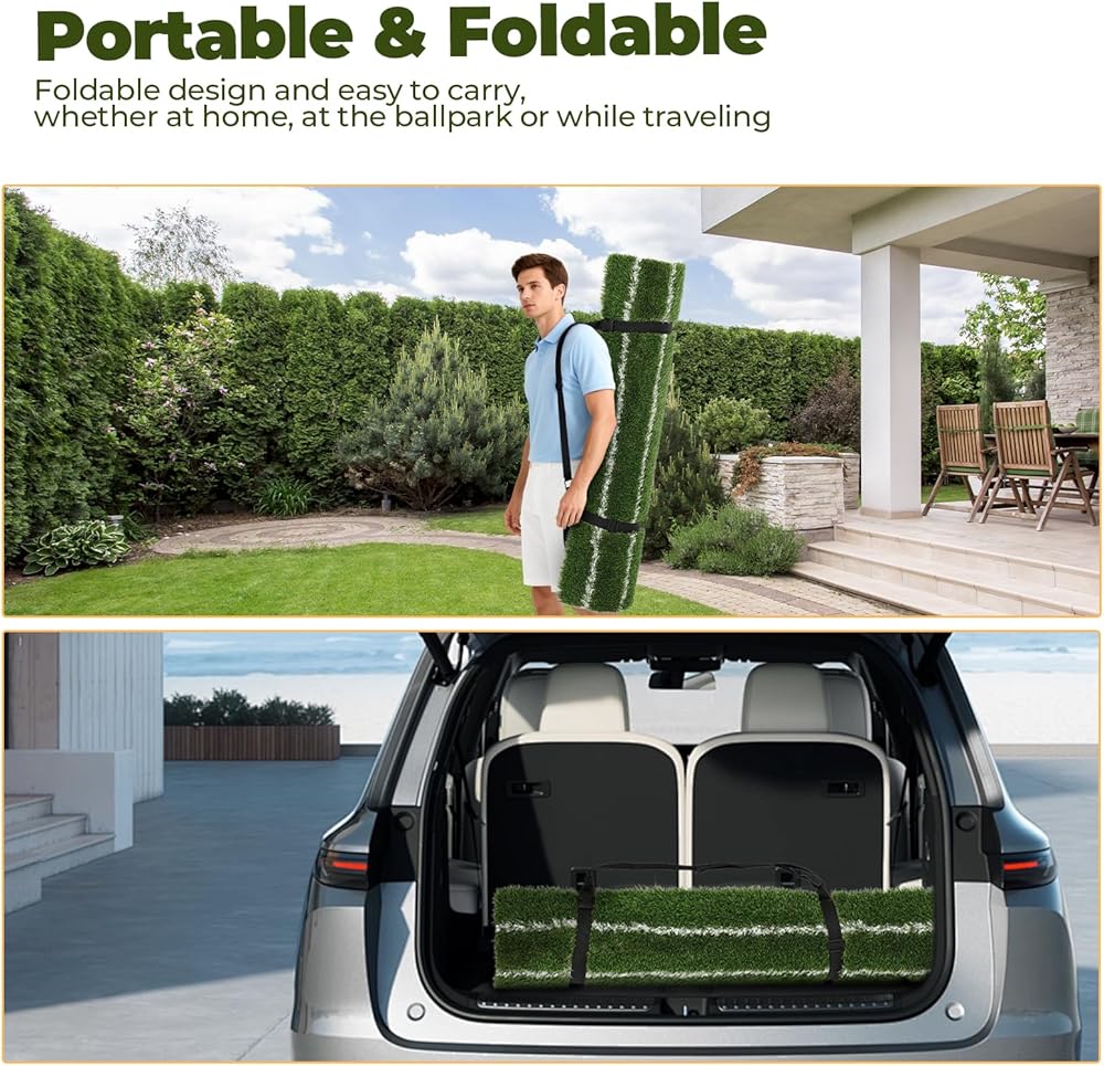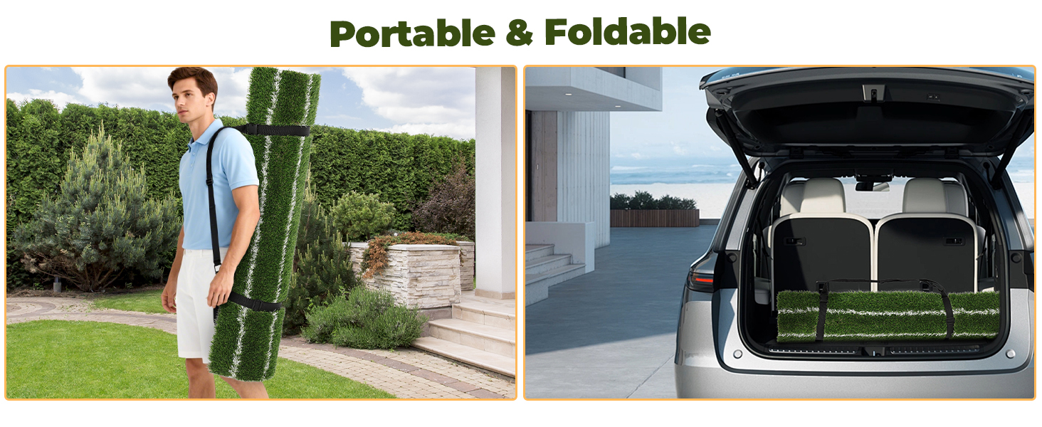 PORTABLE GOLF HITTING MAT: This golf swing mat is portable and can be easily rolled up for storage or transportation. Whether indoors or outdoors, in the backyard, park, garage, shed, basement, poolside, or practice with any club, you can enjoy the fun of swing training and improve your golf skills