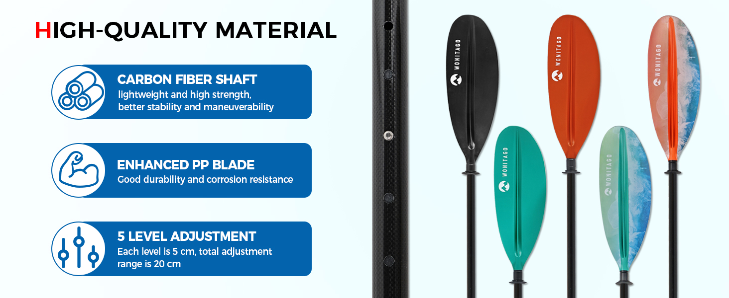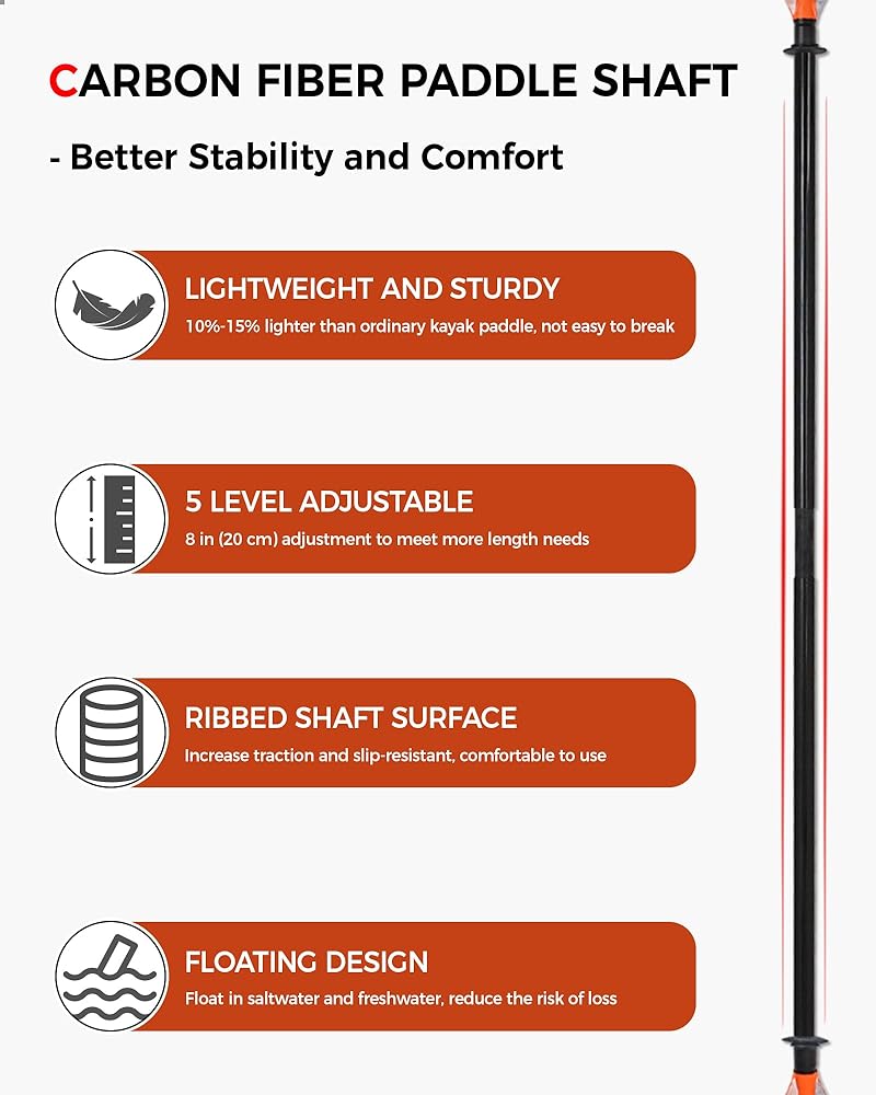 Carbon Fiber Kayak Paddle --- Crafted from the premium carbon fiber shaft (30 mm), lightweight and high strength, better stability and maneuverability than ordinary paddles. The shaft surface has ribbed process to prevent hand slippage
